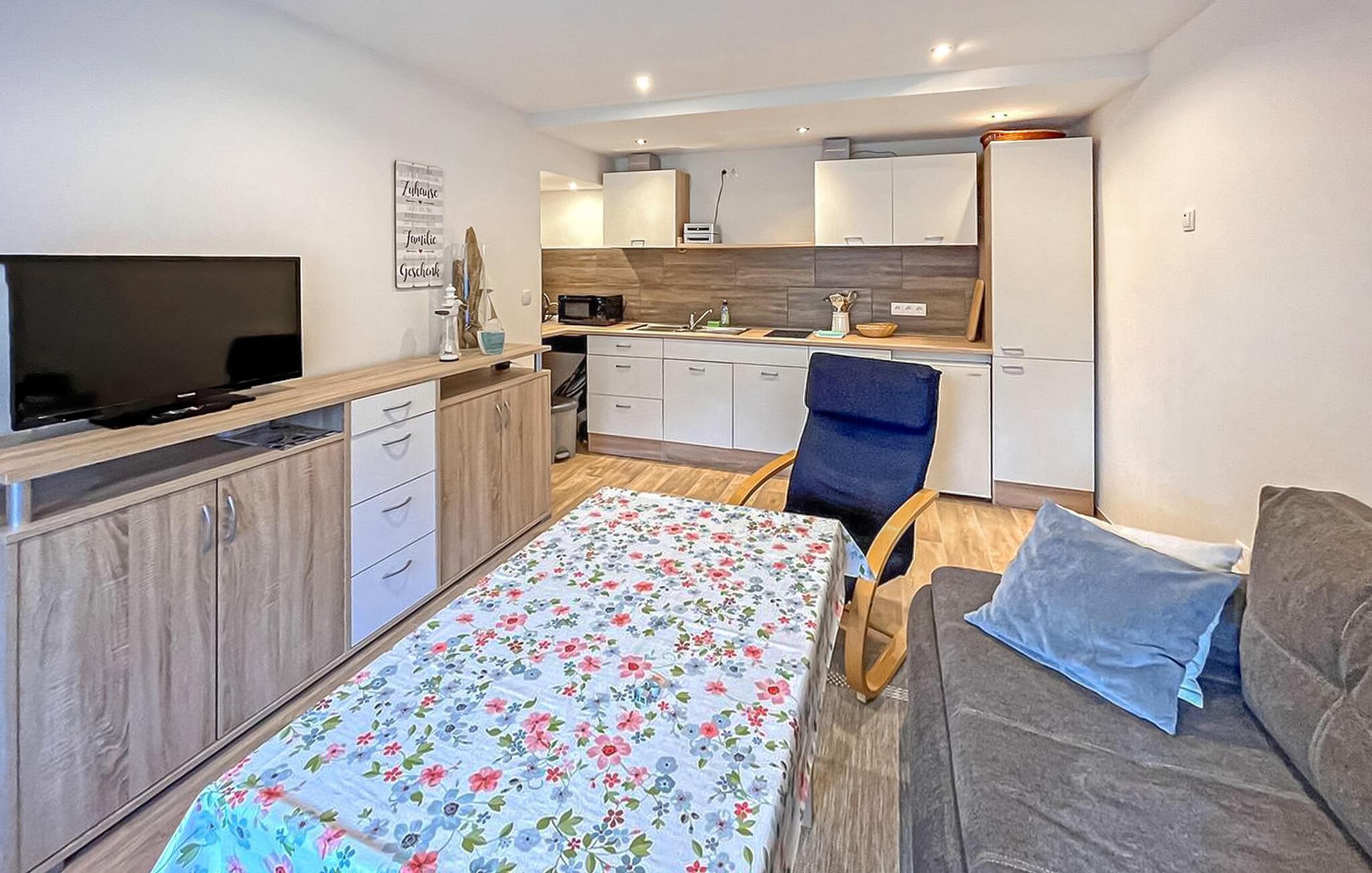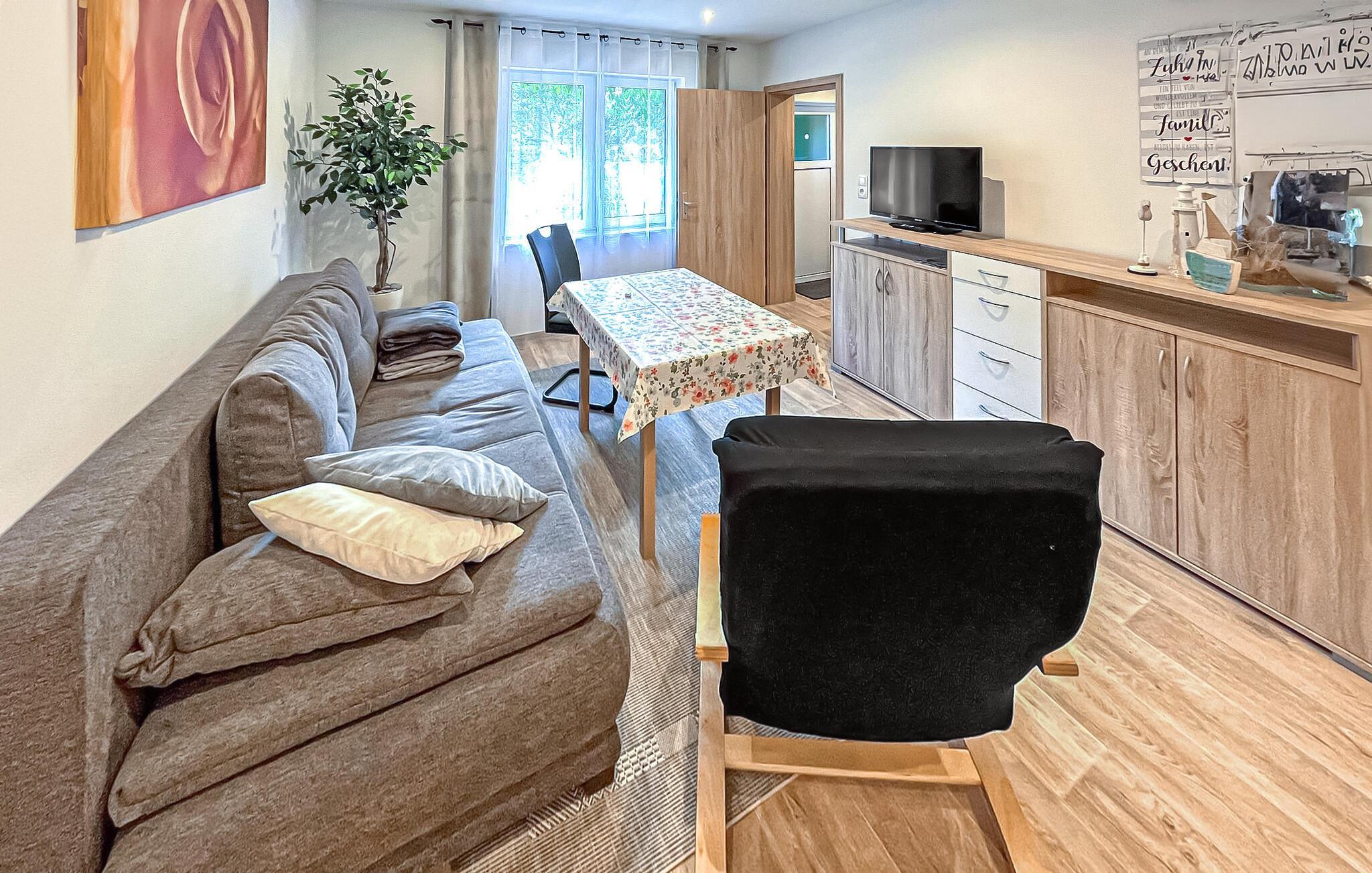 Diese ca. 40 qm große, im Jahre 2022 komplett modernisierte und neu ausgestattete Nichtraucher-Ferienwohnung befindet sich im Erdgeschoss des Nebengebäudes. Sie ist ausgestattet mit einem Wohnraum (Polstermöbel, Schlafcouch; Aufbettung für 2 Personen, Flachbild-TV, Mini-Hifi), einer offenen Küchenzeile (Ceran-Kochfeld, Kühlschrank mit Gefriermöglichkeit, Mikrowelle, div. Küchenkleingeräte), einem Schlafzimmer (Doppelbett), einem Bad (Dusche, WC) sowie einer E-Heizung. Im Außenbereich stehen eine überdachte Terrasse mit Gartenblick, Parkplatz, Fahrrad-Unterstellmöglichkeiten, kostenfreies W-LAN sowie Grillmöglichkeit zur Verfügung.