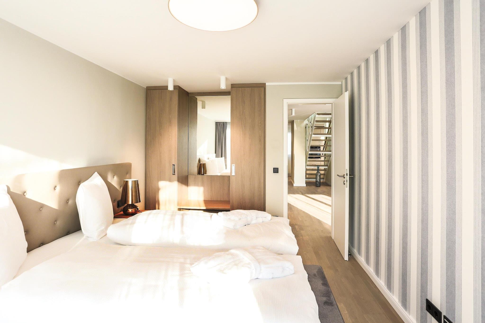 Beautifully located directly on Lake Müritz – just 50 meters from the water with a small beach: High-quality furnished maisonette-style apartments spread over two floors with two balconies and Wi-Fi. Lake Feisneck (100 meters) with a swimming area (600 meters) is also nearby. You will stay in an attractive location two kilometers outside of Waren's town center, right on the edge of the Müritz National Park. The holiday resort consists of modern, villa-style houses, which house the spacious apartments. Tasteful colors and a pleasant interior will accompany you throughout your vacation. Waren (Müritz) has a long tradition as a resort. This lively, small town offers not only museums, churches, and gardens with art and culture, but also shops, restaurants, and colorful markets with regional specialties. Highlights included: Usage-based energy costs, bed linen, towels, final cleaning Wi-Fi 1 rental bathrobe per person and stay (from January 1, 2026) Activities nearby: Kilometers of cycling and hiking trails along the water – this is the best way to actively explore the region's beauty. In addition to excursion boat trips, you should definitely visit the large Müritz National Park, where guided tours are also recommended. A popular day trip destination is the "Müritzeum Nature Experience Center." Culture lovers will find their money's worth in surrounding towns with monuments and sights. If your own kitchen is cold, numerous restaurants offer Mecklenburg-style home cooking or fresh fish from the Müritz Lake.