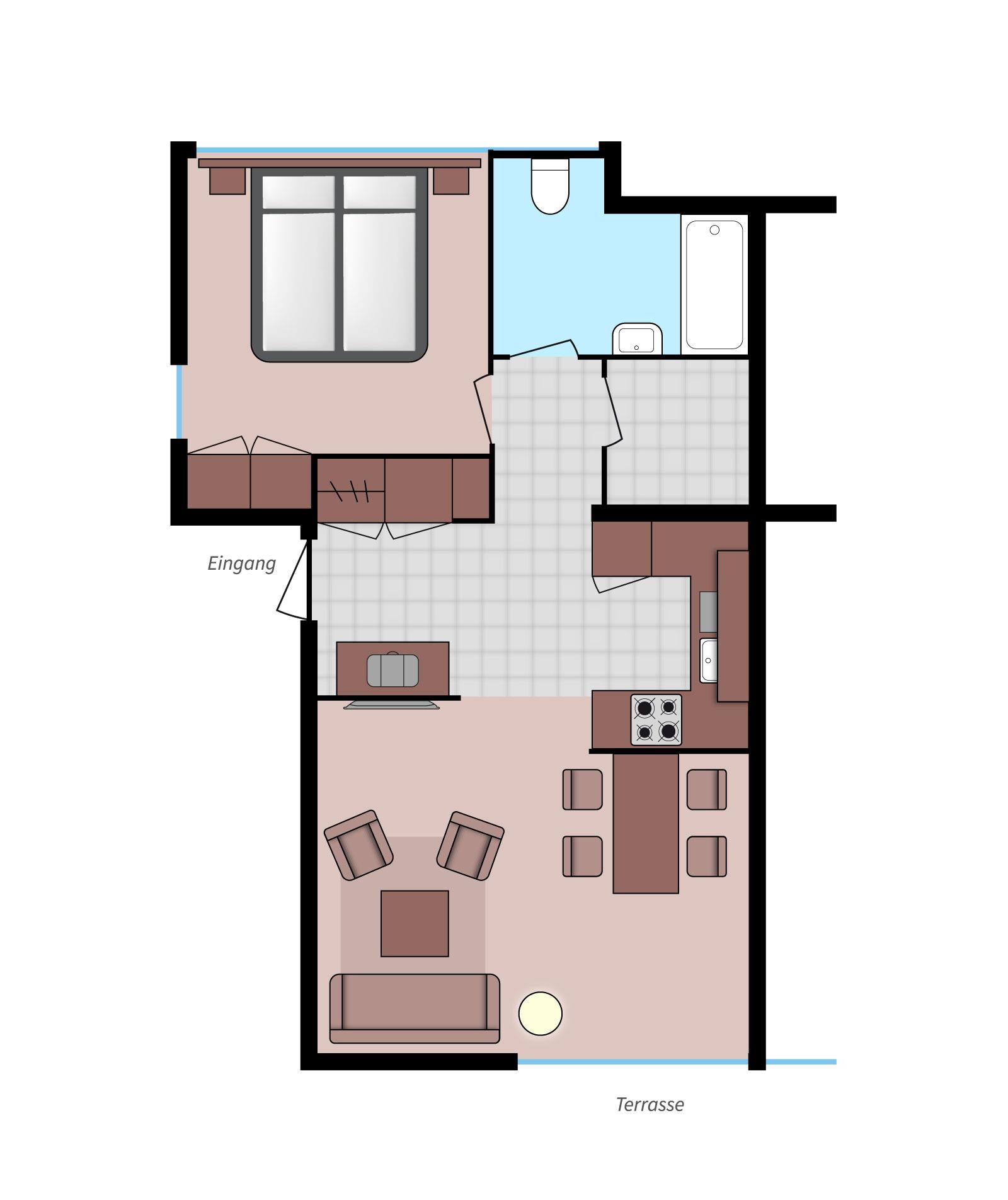 Unsere Ferienwohnungen Kölpinsee im Erdgeschoss bieten viel Platz für einen entspannten Urlaub. Sie sind ideal für zwei Personen geeignet. Die voll ausgestattete Küche ist offen zum Wohnbereich. Auf der möblierten Terrasse können unsere Gäste entspannen und gerne abends auch grillen.