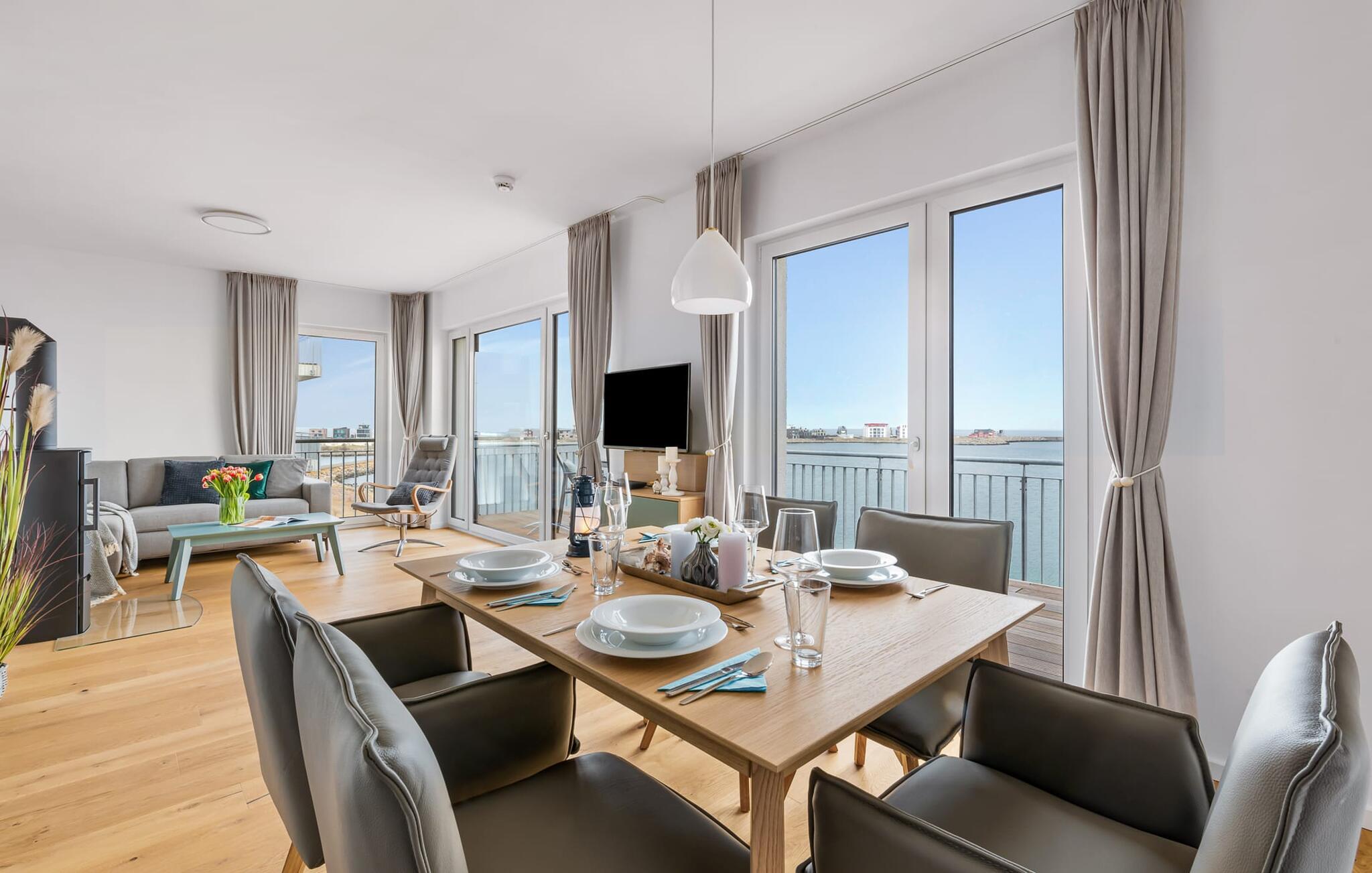 Der Blick fällt aus dem gesamten Wohn-/Essbereich und dem Balkon auf die atemberaubende Wasserkulisse von Ostsee, Schlei, Strand und Marina des OstseeResort Olpenitz. Vorbeifahrende Segelschiffe, Möwen in der Luft und Ostseebrise machen Lust auf Meer. WATT’N BLICK der Name hält, was er verspricht!
