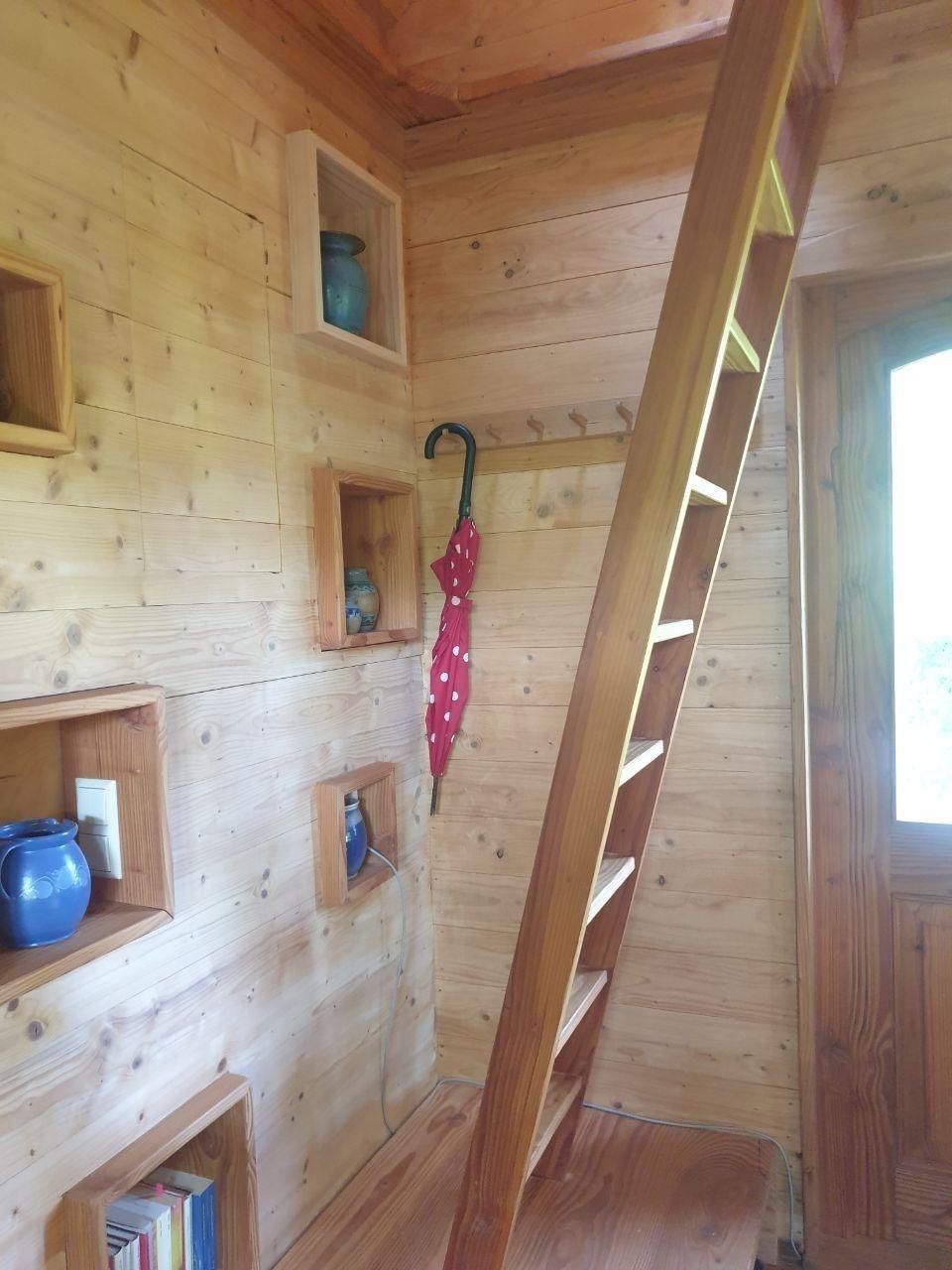Die Unterkunft ist komfortabel mit viel Liebe fürs Detail ausgestattet. Das Häuschen wurde mit hochwertigen, biologischen Materialien vorwiegend aus Holz und Lehm erstellt. Für die elektrische Installation wurden abgeschirmte Leitungen verwendet. Die Fussbodenheizung verhilft zu einer angenehmen, unaufdringlichen Wohlfühlwärme. In dem Häuschen steht ein Internetanschluss über LAN Kabel zur Verfügung, auf WLAN und Fernseher haben wir bewußt verzichtet. Zum Schlafen geht es über eine Trittleiter nach Oben in den Spitz.