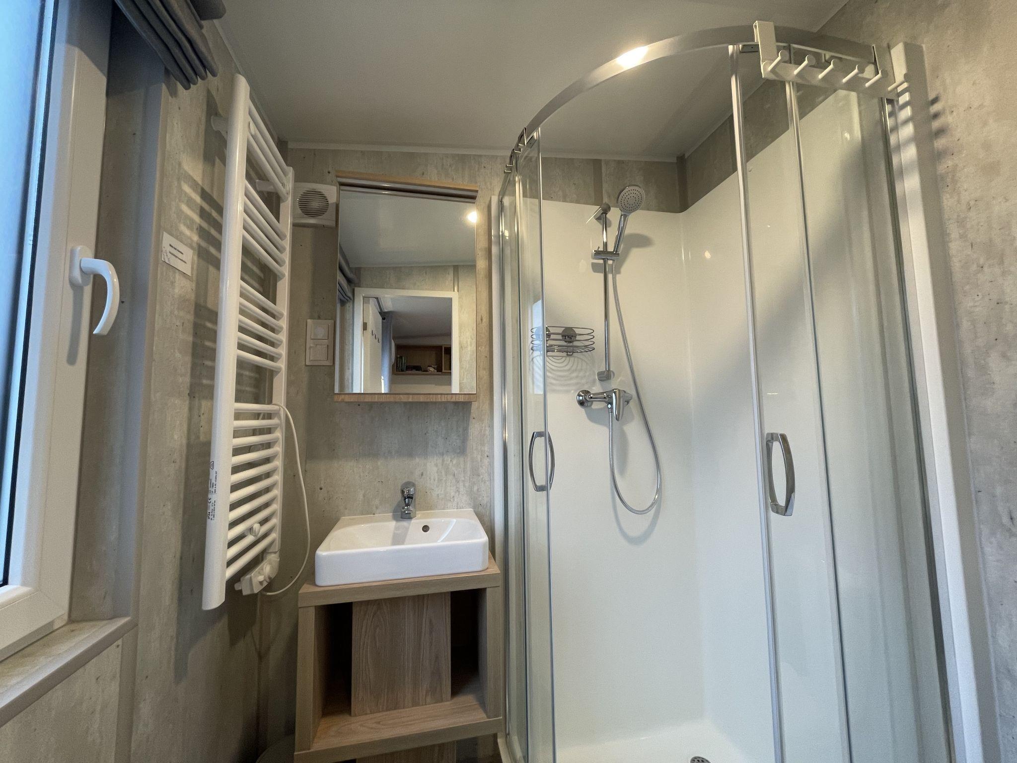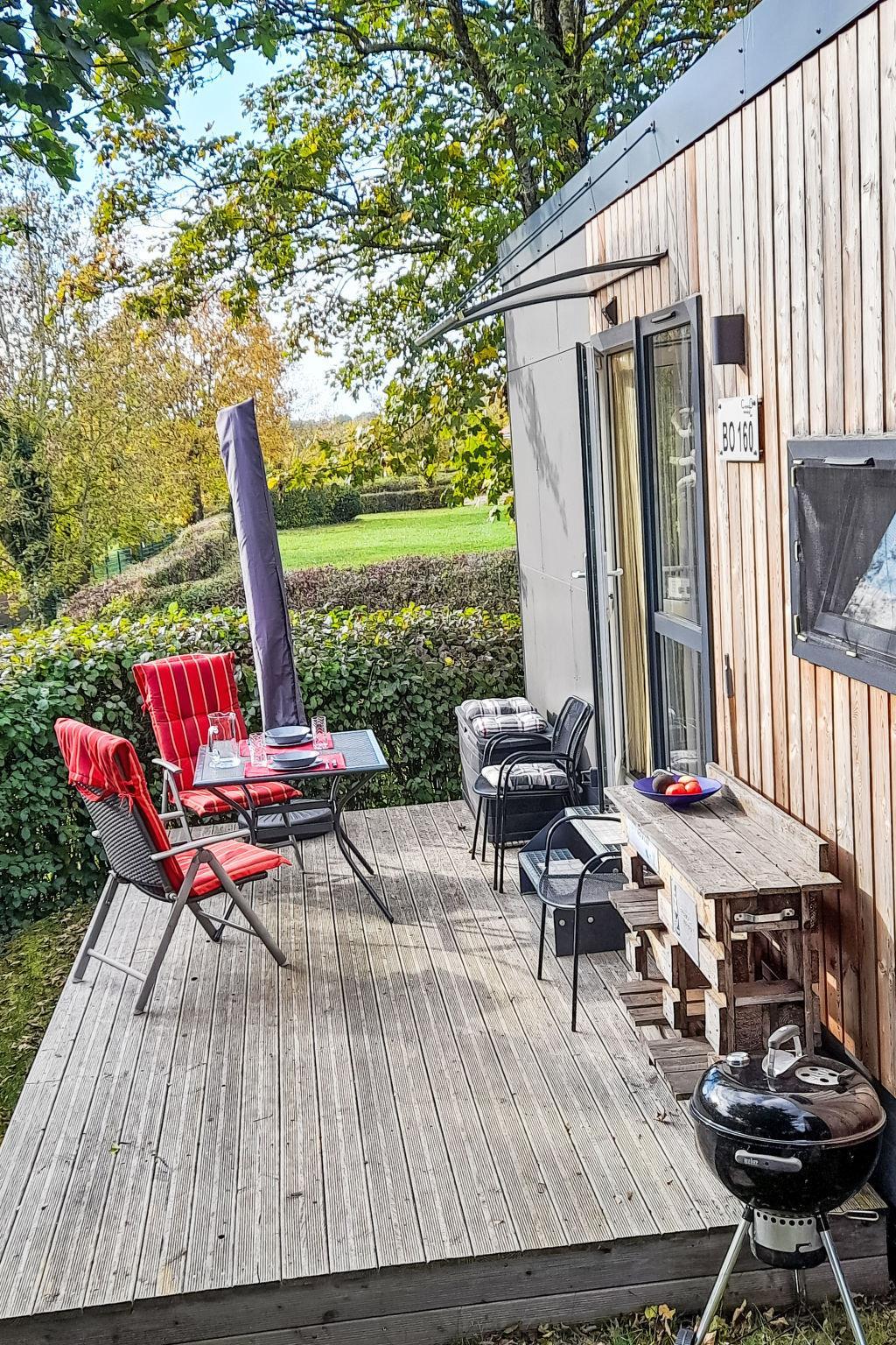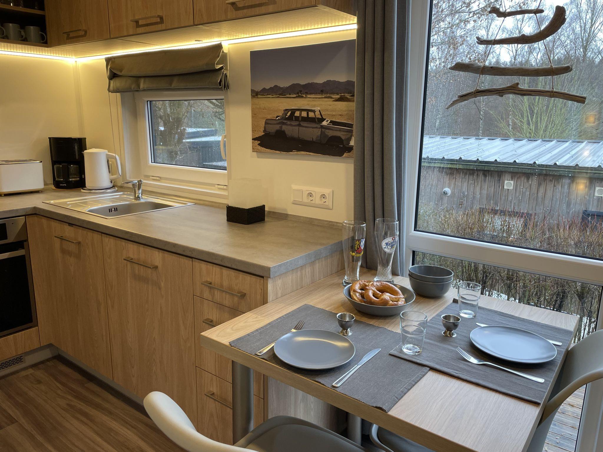 "Tiny Haus Auszeit am See", 2-room mobile home 25 m2, on the ground floor. Object suitable for 2 adults + 2 children. Cosy furnishings: living/sleeping room with 1 double sofabed and satellite TV. Exit to the terrace. 1 room with 1 french bed (140 cm, length 200 cm). Open kitchen (oven, 2 induction hot plates, toaster, kettle, electric coffee machine). Shower/WC. Electric heating, air-conditioning. Terrace. Terrace furniture, barbecue, deck chairs. Facilities: children's high chair. Please note: non-smoking house. Smoke alarm. ATTENTION: The Wi-Fi connection may be limited depending on capacity.