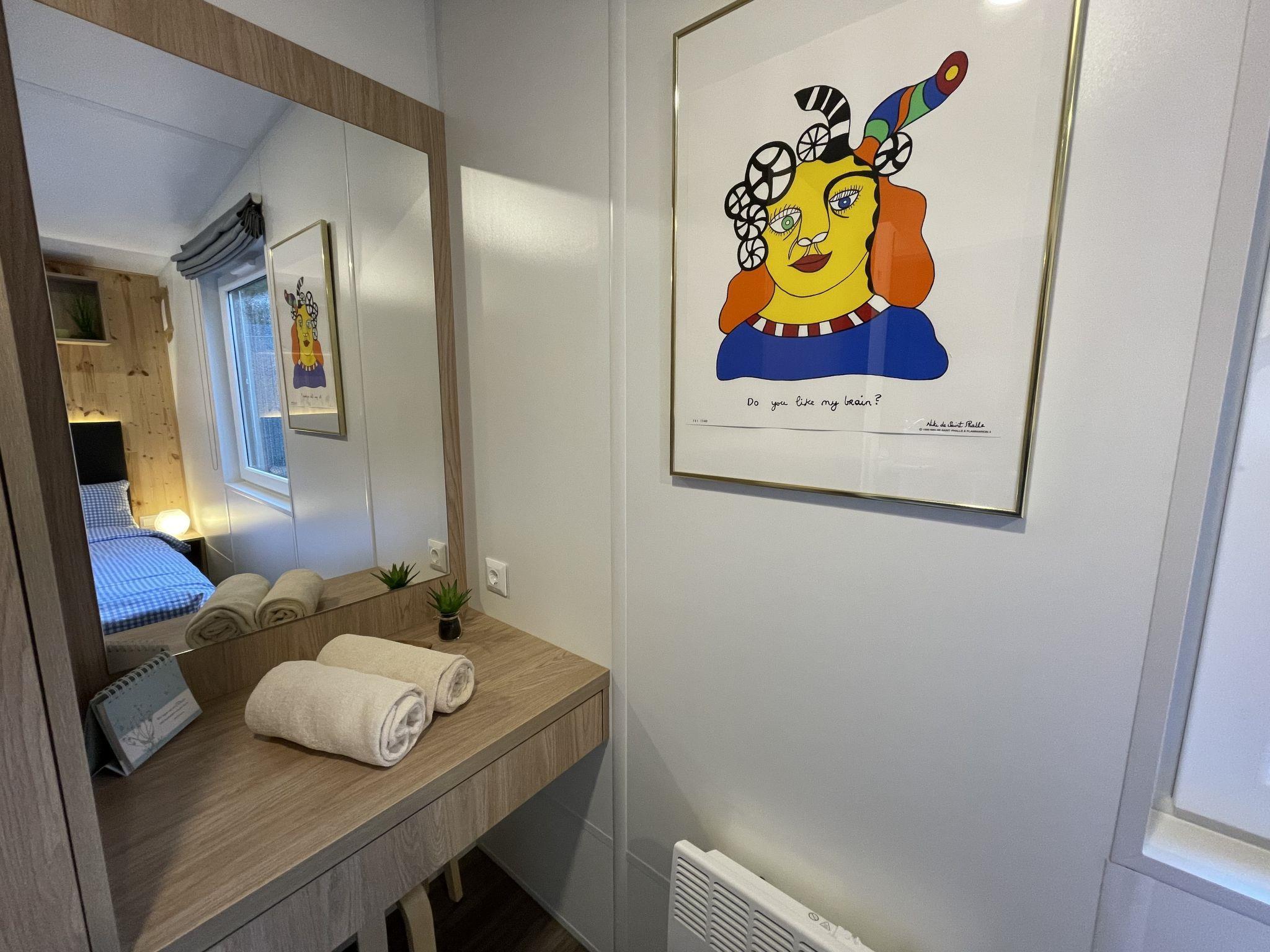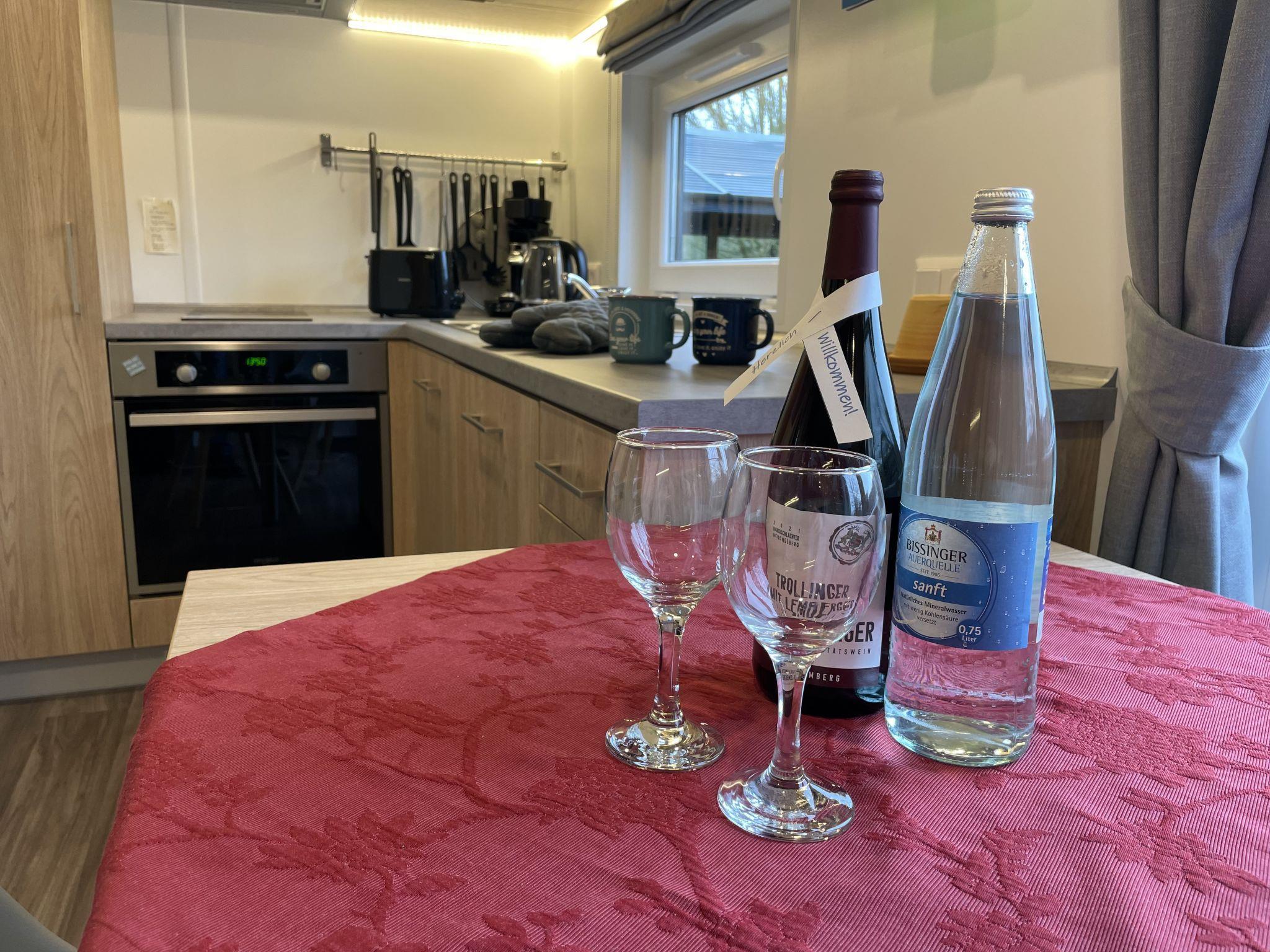 "Tiny Haus Neschtle", 2-room mobile home 25 m2. Object suitable for 2 adults + 2 children. Cosy furnishings: living/sleeping room with 1 double sofabed and satellite TV. Exit to the terrace. 1 room with 1 french bed (140 cm, length 200 cm). Open kitchen (oven, 2 induction hot plates, toaster, kettle, electric coffee machine). Shower/WC. Electric heating, air-conditioning. Terrace. Terrace furniture. Parking space n 144 at 20 m. Please note: non-smoking house. Maximum 1 pet/ dog allowed. ATTENTION: The Wi-Fi connection may be limited depending on capacity.