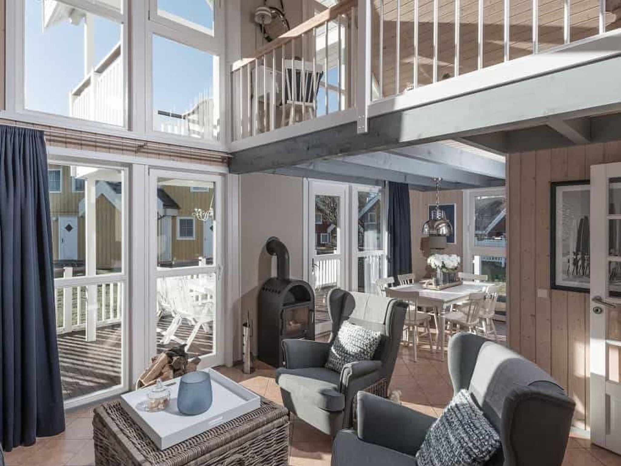 Auf einer Halbinsel im Hafen liegen diese Doppelhaus-Typen mit 98 m² Wohnfläche für 6 Personen auf zwei Ebenen. Mit 3 Schlafzimmern, einer offenen Galerie mit gemütlicher Sitzecke und 2 Bädern bietet dieses Haus viel Platz und Flexibilität. Große Fenster und eine offene Raumgestaltung sorgen für ein helles und großzügiges Wohngefühl. Die Terrasse führt direkt auf das Gartengrundstück und von der Galerie aus haben Sie einen direkten Zugang zum Balkon.