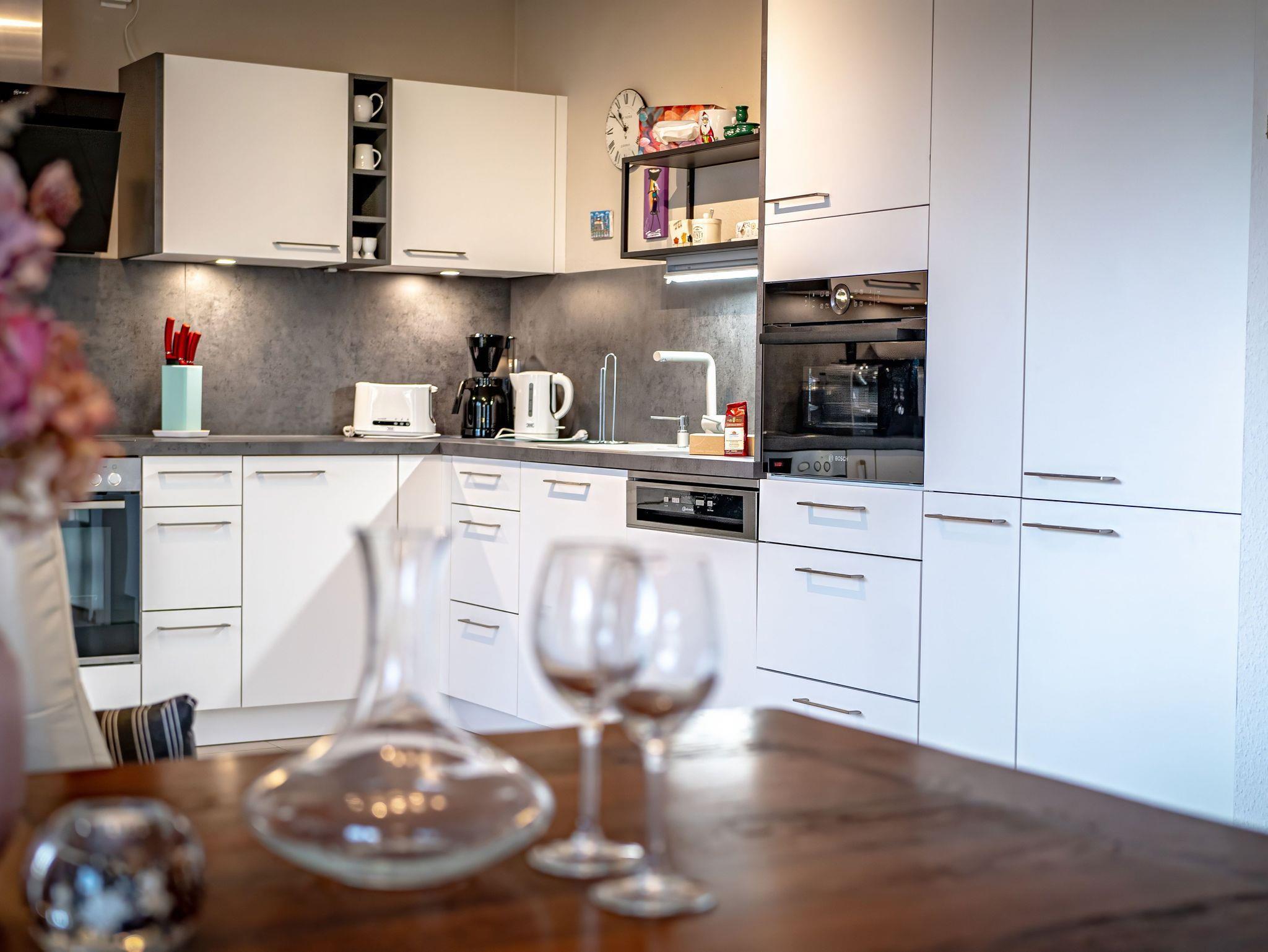 • Moderne, offene Wohnküche mit Herd, Backofen, Mikrowelle, Dampfgarer, Geschirrspüler, Kühl-Gefrierkombination, Kaffeemaschine, Nespresso Maschine und weitere Küchenutensilien