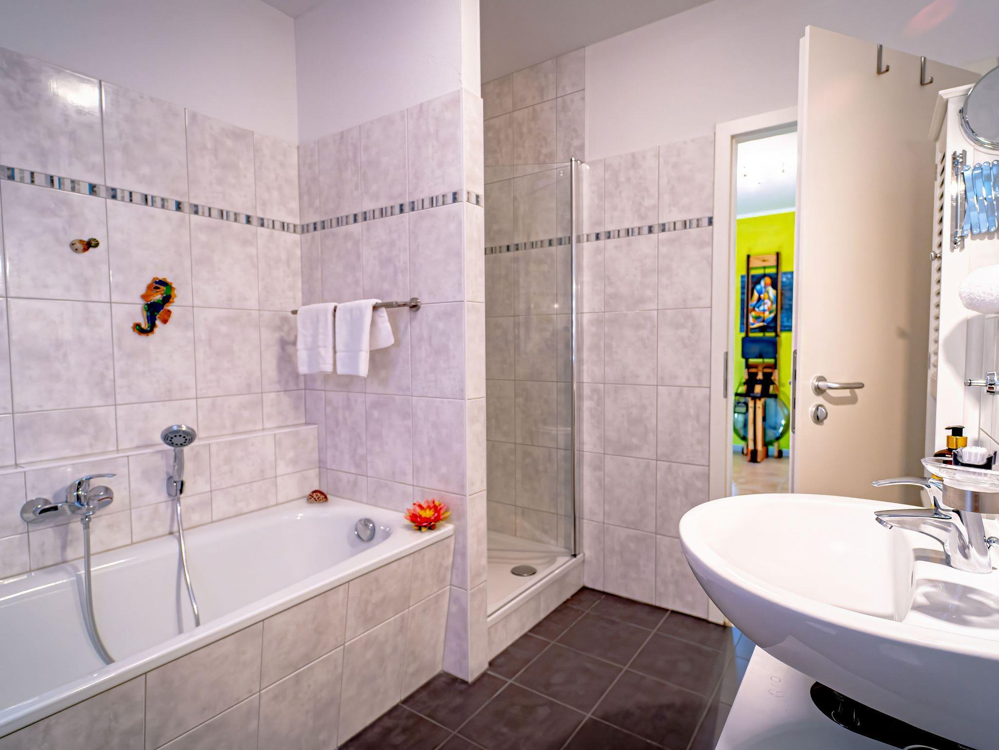 • Badezimmer mit Badewanne, Dusche, Waschbecken und WC