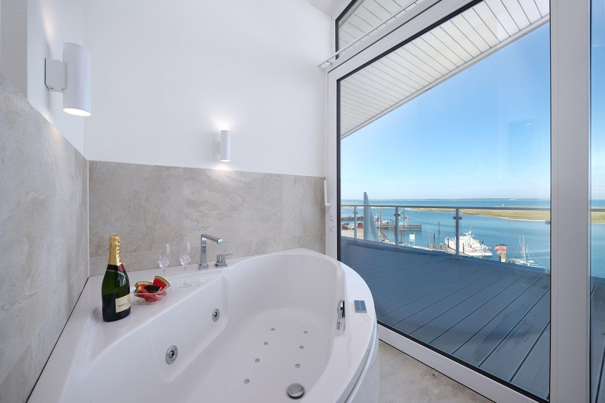 Das Wohnzimmer ist ausgestattet mit einer gemütlichen Sitzecke mit Fernseher und Blu-Ray-Player, einer Musikanlage mit CD-Player und einem wärmenden Bioethanol-Kamin. Der äußerst großzügige Balkon lädt mit komfortablen Sitzmöbeln und zwei Sonnenliegen zu schönen Stunden ein. Auch die hochwertige Küche ist bestens ausgestattet, sogar ein integrierter Wok ist hier vorhanden. Alle drei Schlafzimmer verfügen über ein Doppelbett und einen eigenen Fernseher. Der Master-Bedroom mit Blick in die Marina besitzt einen direkten Zugang zum Balkon und ein integriertes Badezimmer, hier ist das besondere Highlight die Badewanne mit Whirlpool-Funktion und der grandiose Blick über das Meer - Entspannung pur! Wenn Sie nicht so gerne baden, nutzen Sie einfach die angrenzende Duschkabine mit großer Regendusche, diese kann auch als Dampfsauna genutzt werden.
