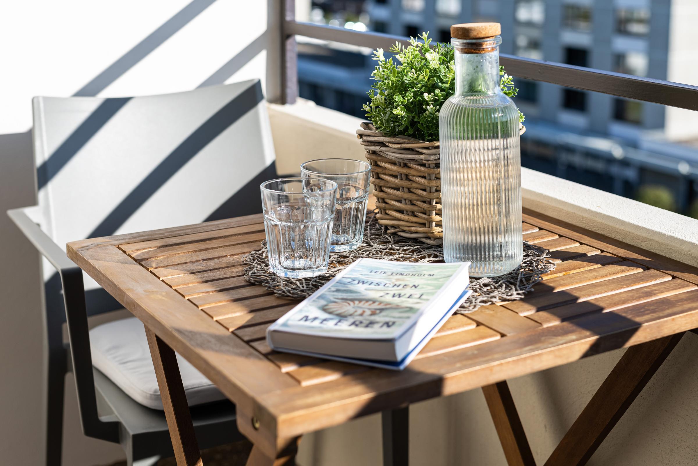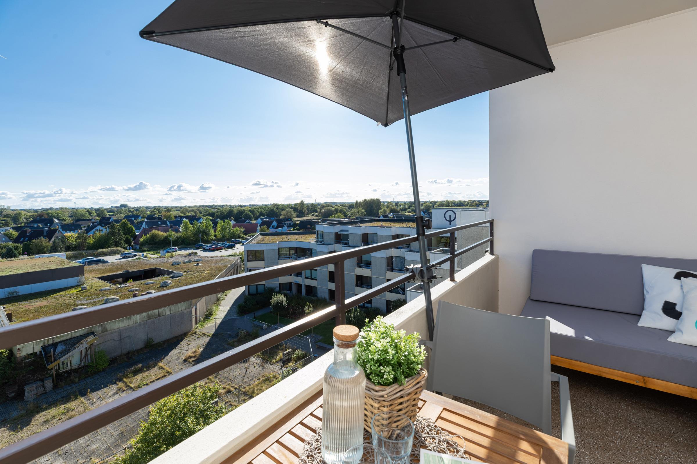 Der offene Wohn- und Schlafbereich ist gemütlich eingerichtet und verfügt über ein komfortables Doppelbett, einen Flachbild-TV sowie eine große Fensterfront, die viel Licht hereinlässt und den Blick auf die traumhafte Landschaft Schleswig-Holsteins freigibt. Vom Wohnbereich aus gelangen Sie auf den Balkon mit Südausrichtung, der mit Sitzmöbeln ausgestattet ist – perfekt, um Tage in der Sonne zu genießen.