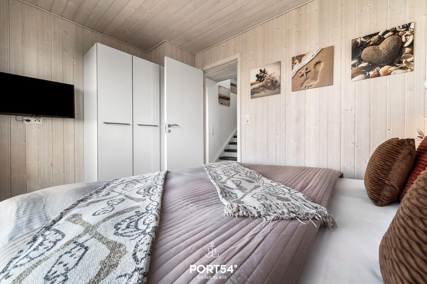 Im Erdgeschoss befinden sich zwei Schlafzimmer. Eines davon bietet zwei zusammengeschobene Einzelbetten (zusammen 180x200cm) und das andere zwei Einzelbetten (je 90x200cm). Eines der Schlafzimmer verfügt über einen TV, sowie beide über verdunkelbare Fenster. Ebenfalls im Erdgeschoss gelegen: das Badezimmer mit ebenerdiger Dusche, WC, Waschbecken und Trockensauna.