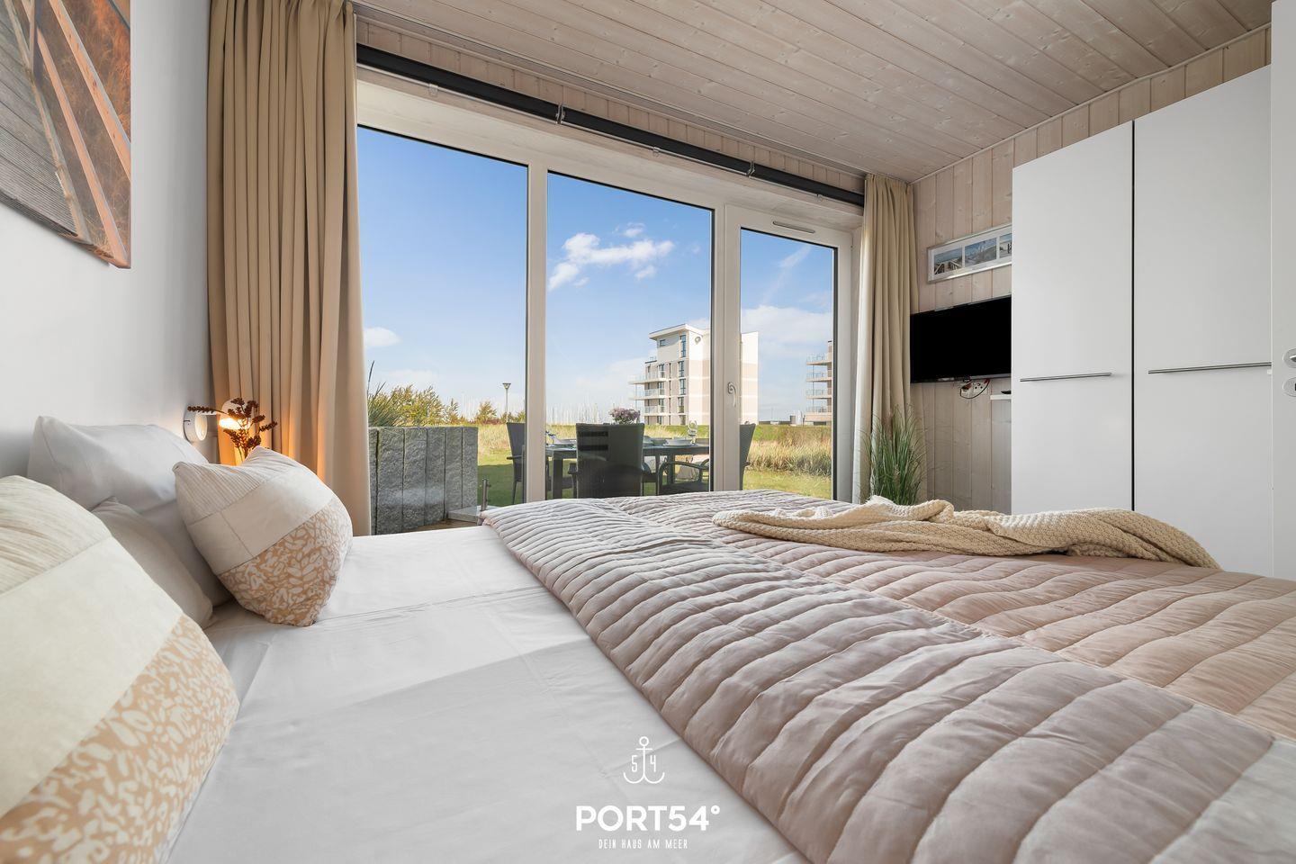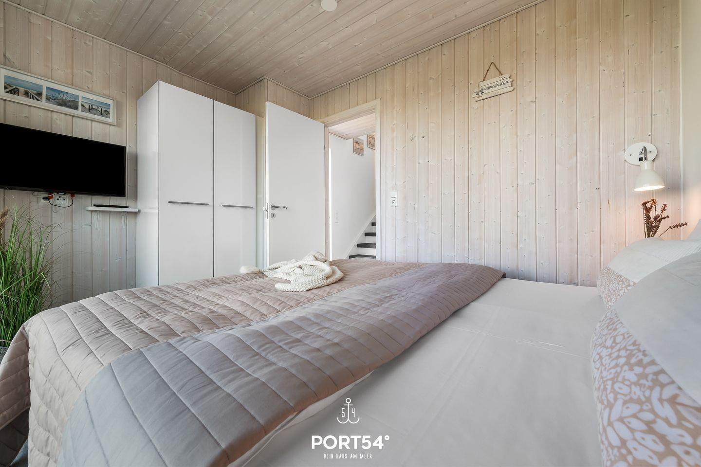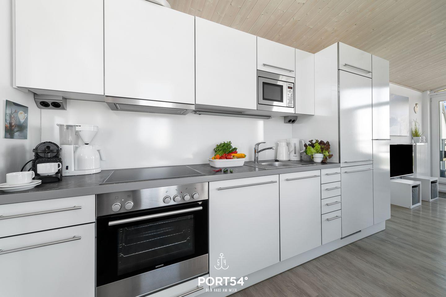 Im ersten Obergeschoss erwartet Sie ein offener, lichtdurchflutetet Wohn- und Essbereich mit angrenzender vollausgestatteter Küche. Der gemütliche Wohnbereich bietet ausreichend Sitzgelegenheiten, einen 50-Zoll-SmartTV, einen Bioethanol-Kamin und den Zugang zum Balkon. Die vorhandene Klimaanlage verspricht ein angenehmes Innenraumklima zu jeder Zeit. Im Außenbereich befinden sich Sitzmöglichkeiten, ein Sonnenschirm, Sonnenliegen sowie ein Weber-Elektrogrill. Ebenfalls befindet sich am Haus ein kostenfreier PKW Stellplatz und ein abschließbarer Fahrradschuppen. Vom Balkon aus genießen Sie den Blick auf die Ostsee und den Yachthafen.