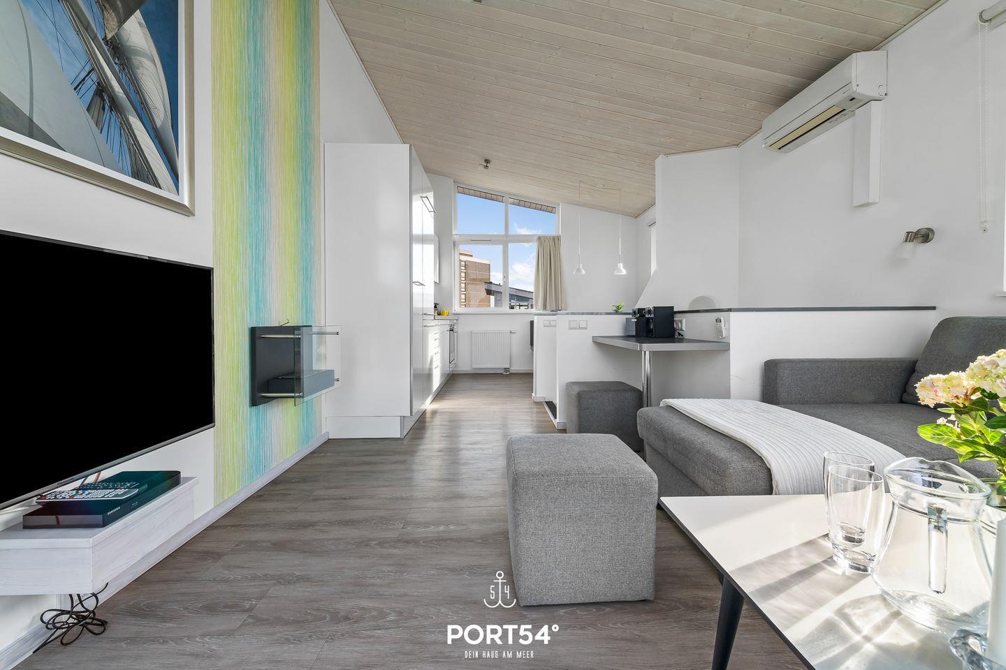 Im ersten Obergeschoss erwartet Sie ein offener, lichtdurchfluteter Wohn- und Essbereich mit angrenzender vollausgestatteter Küche. Der gemütliche Wohnbereich bietet ausreichend Sitzgelegenheiten, einen 50-Zoll-SmartTV, einen Bioethanol-Kamin und den Zugang zum Balkon. Die vorhandene Klimaanlage verspricht ein angenehmes Innenraumklima zu jeder Zeit.