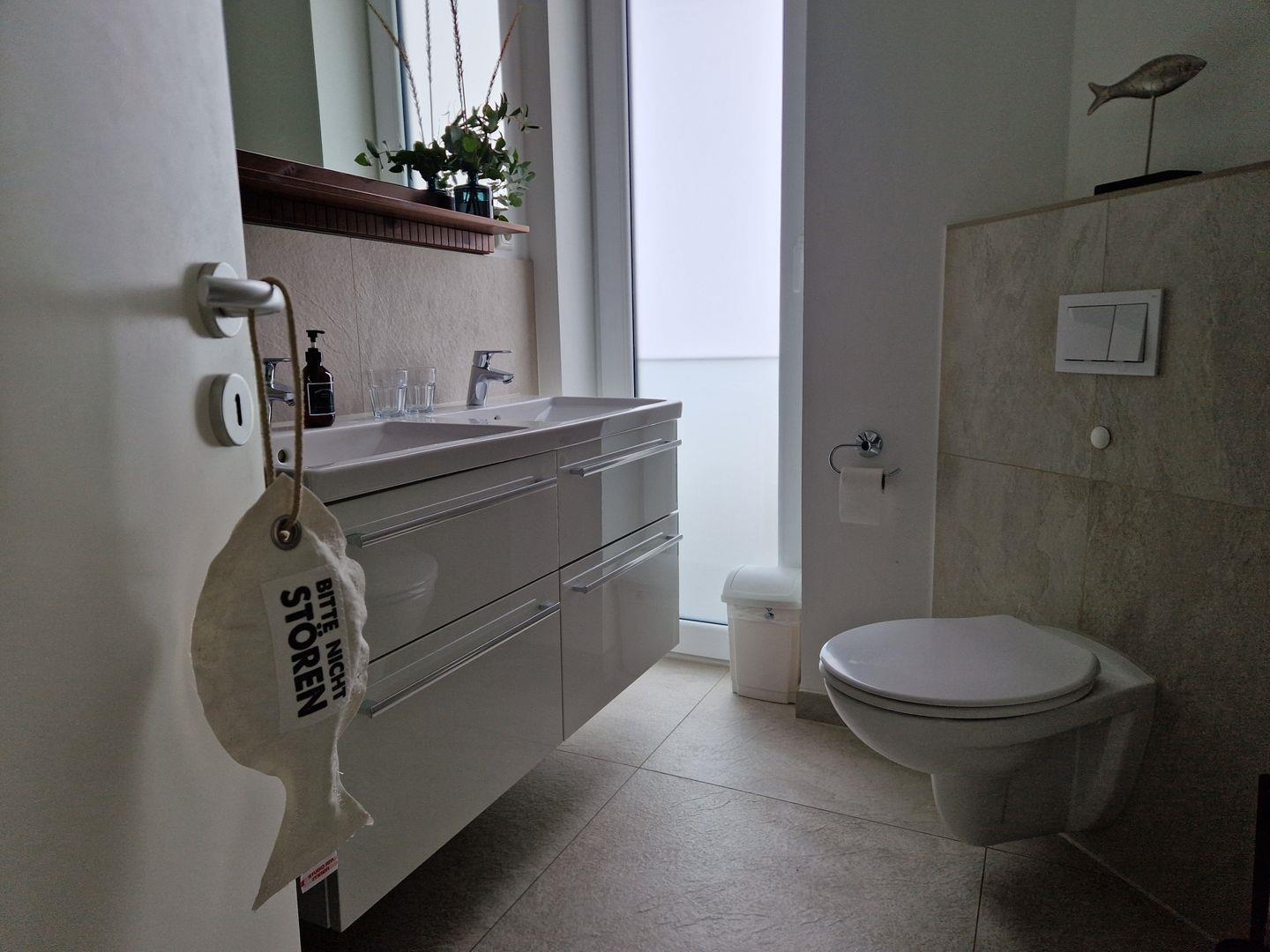 Für entspannte Wellnessmomente sorgt die luxuriöse Dampfdusche für zwei Personen im modernen Badezimmer der Ferienwohnung. Das Badezimmer verfügt über eine angenehme Fußbodenheizung. Hier können Sie sich nach einem Tag an der frischen Luft oder einem Spaziergang entlang der Küste rundum verwöhnen lassen und die wohlige Wärme und den feinen Dampf genießen. Die Wellnessdusche mit bodenebenem Zugang verwandelt Ihr Badezimmer in eine kleine Wohlfühloase und lässt den Alltagsstress im Nu vergessen.