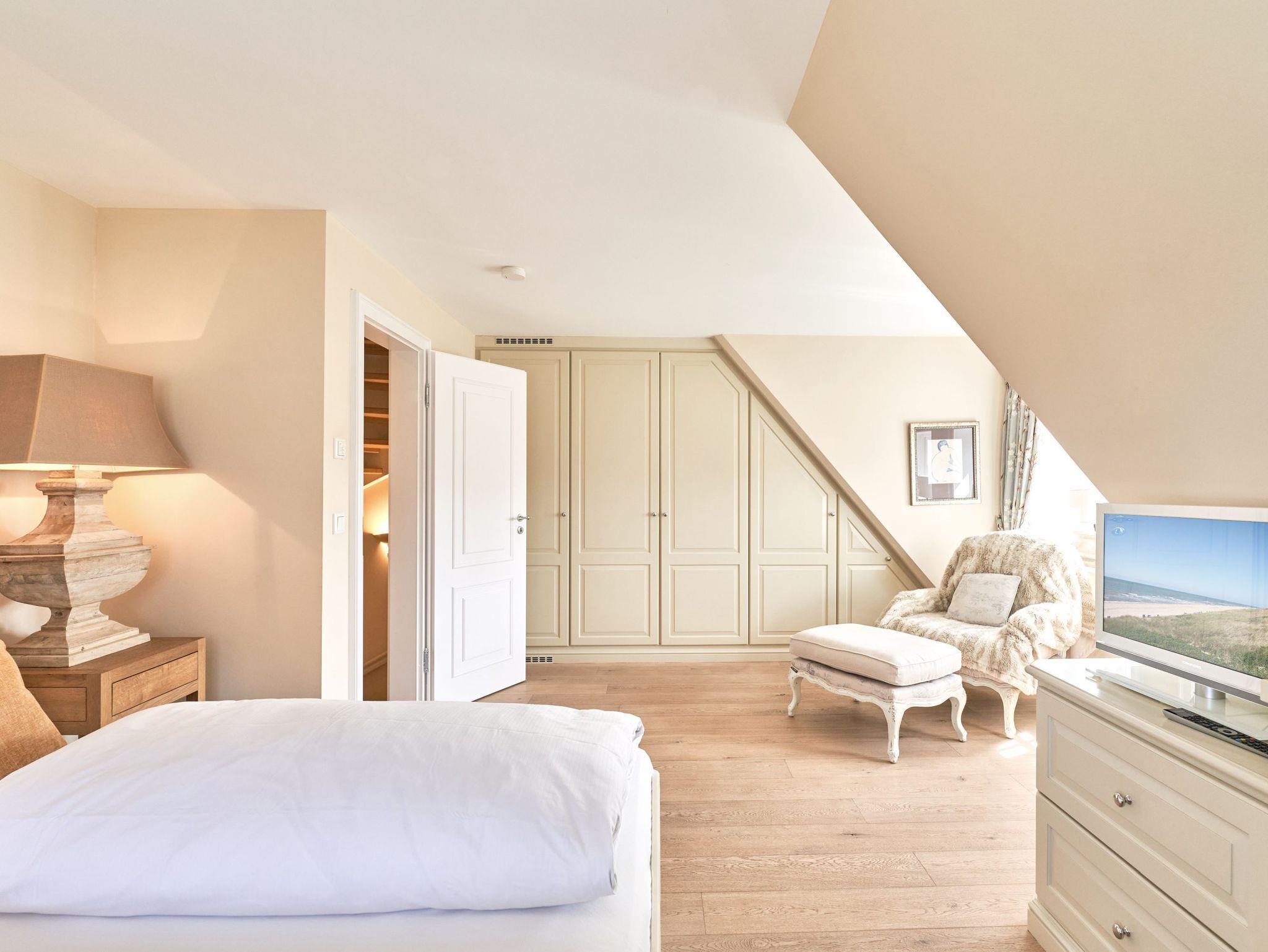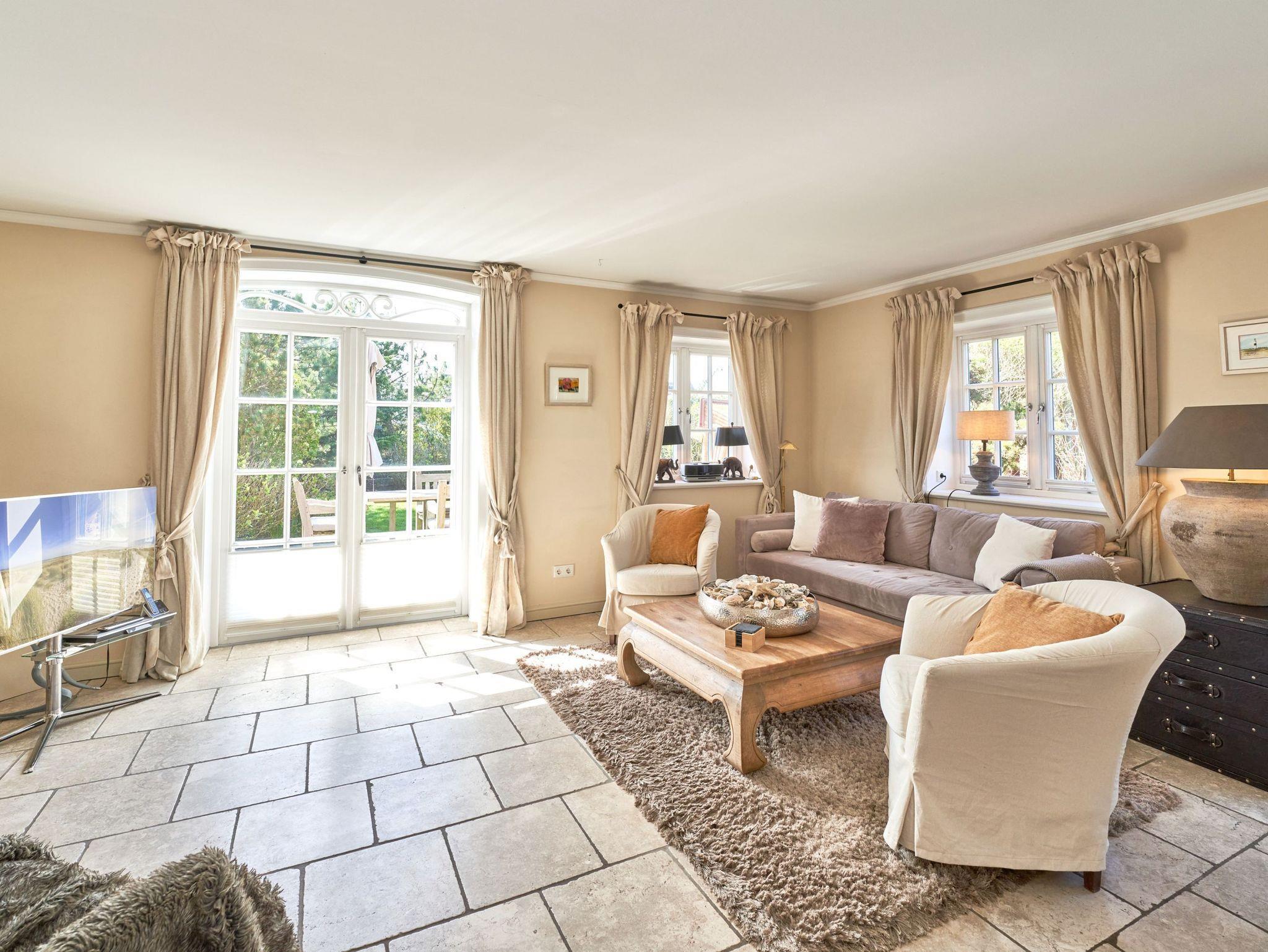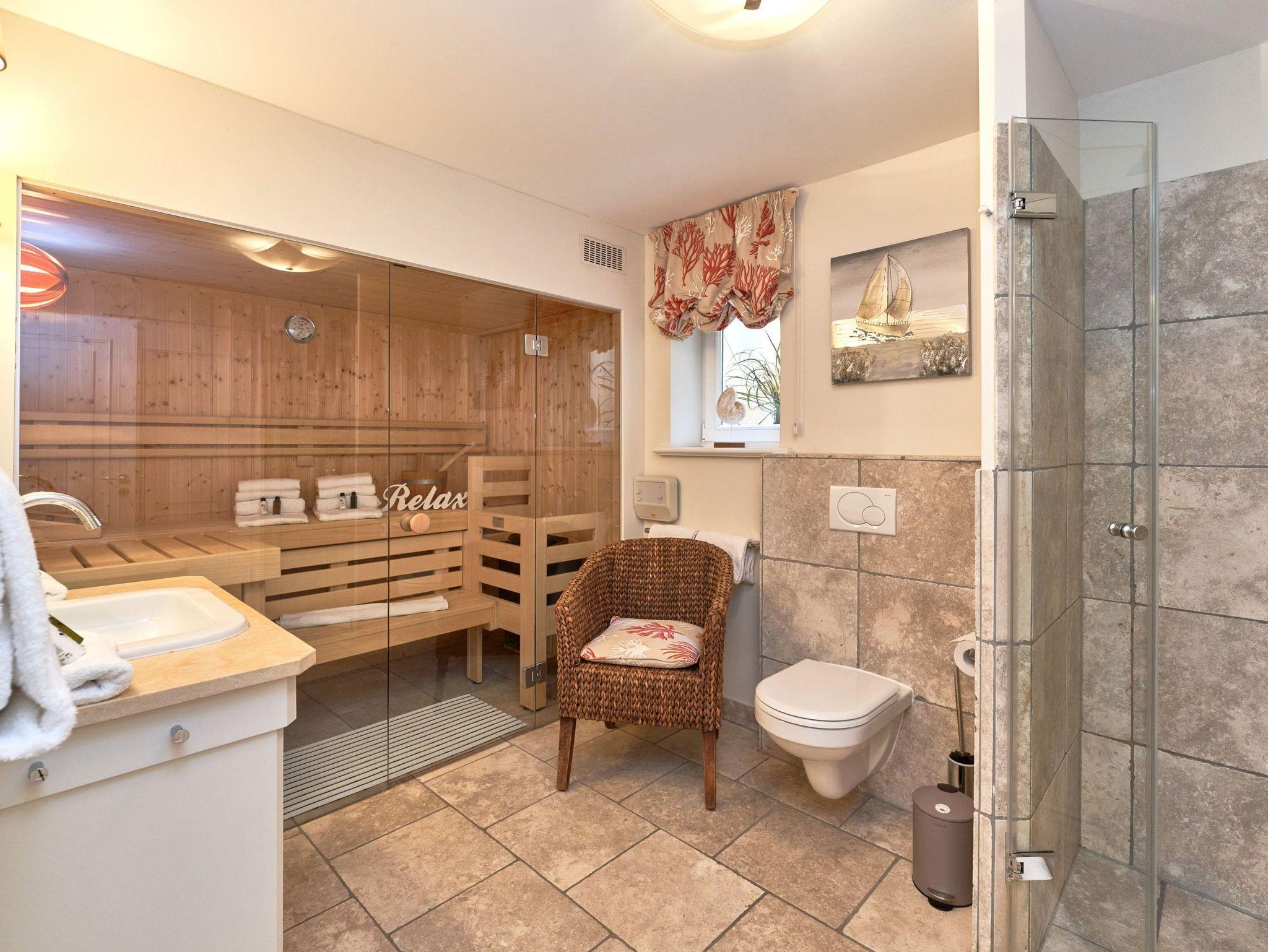 Das Ambiente auf den drei Ebenen des Hauses erfreut durch liebevoll ausgesuchte Ausstattung und im modernen Landhaus Stil. Der lichtdurchflutete Wohnraum, die herrliche Süd-West Terrasse tragen zu ihrem Wohlbefinden bei. Das Sunny Hüs wurde mit sehr viel Liebe zum Detail eingerichtet. Im Erdgeschoss befindet sich die Diele mit seinen großzügigen Garderobenschrank und das angrenzende Gäste - WC. Durch eine Doppeltür betreten Sie ein helles und großzügiges Wohnzimmer mit einem antiken, nordischen Kachelofen, eine offene Küche mit angrenzender Essecke für 6 Personen ist ebenfalls vorhanden. Im Obergeschoss erwartet Sie ein geräumiges Schlafzimmer mit Doppelbett und Schrankeinbauten und der Fußboden ist mit gekelchten Echthausdielen ausgestattet. Außerdem hat das Schlafzimmer noch einen Elektrokamin und verfügt über einen Fernseher. Das angrenzende große Badezimmer mit Dusche und Wanne verfügt noch über ein Waschtisch mit zwei aufgesetzten Waschbecken. Die Diele im Obergeschoss verfügt über einen kleinen separaten Arbeitsplatz und ein Bucherregal. Im Untergeschoss befinden jeweils zwei Schlafzimmer mit einen Doppelbett und Einbauschränken. sowie ein Badzimmer mit Dusche und WC. Für Ihr Wohlbefinden gibt es hier noch eine Sauna mit Glasfront mit Blick in das Badezimmer. Ein kleiner separater Hauswirtschaftraum mit Waschmaschine und Trockner ist ebenfalls vorhanden.