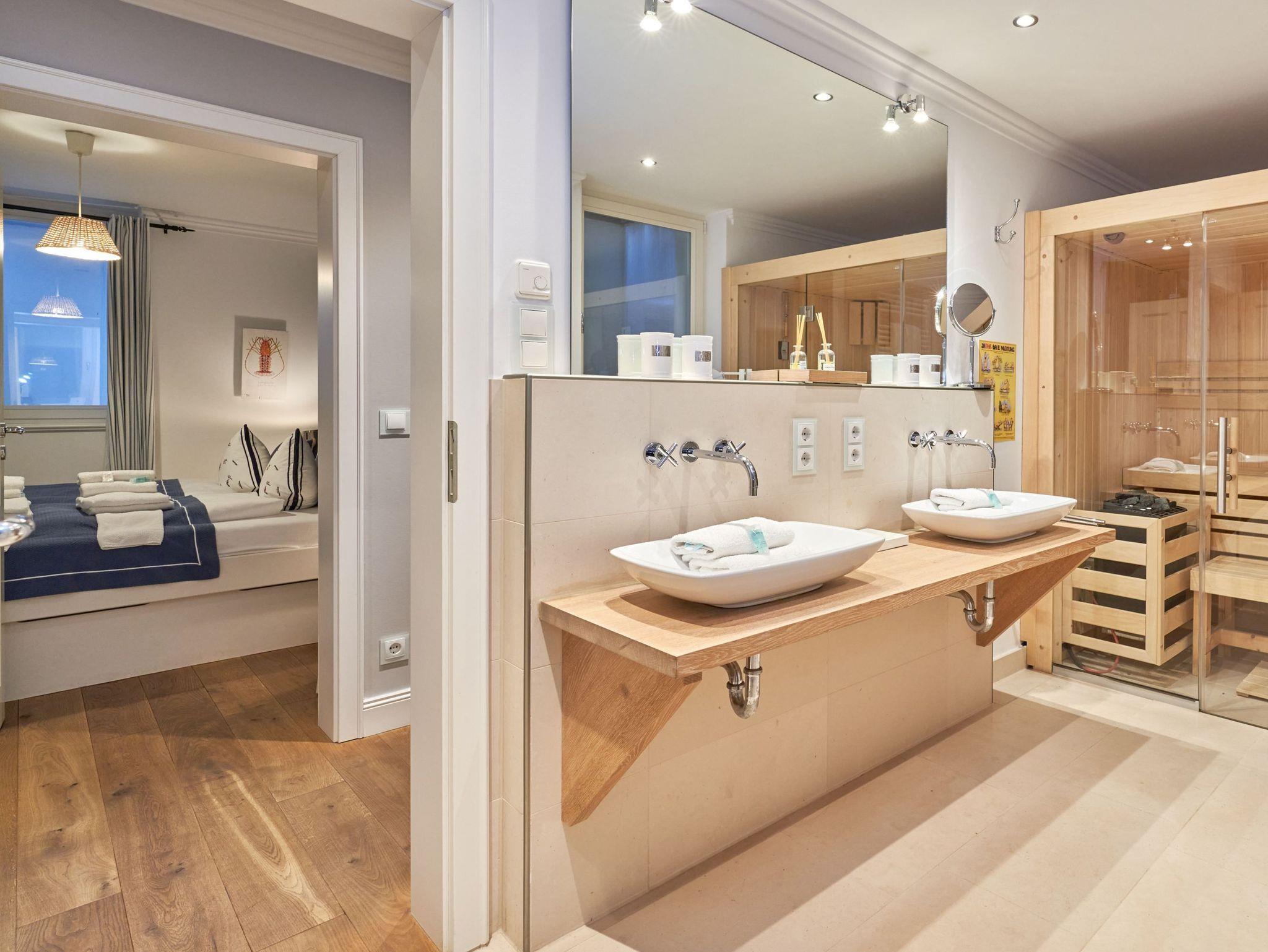 Exklusive Doppelhaushälfte unter Reet im Hampton Style für bis zu 8 Personen. Außen Sylt , innen Hamptons. Über einen kleinen Vorflur mit Garderobe gelangt man in das großzügige Wohnzimmer mit seiner offenen Küche mit den angrenzenden Essplatz für gemütliche Abende. Auffällig und besonders neben der hochwertigen Ausstattung ist das Beleuchtungskonzept sowie die Holzeinbauten mit IPhone - Ladestationen. Im Obergeschoss verfügt über zwei Schlafzimmer und ein Badezimmer mit bodengleicher Dusche. Der ausgebaute Spitzboden verfügt über zwei weitere Einzelbetten. Im Untergeschoss befindet ein Schlafzimmer mit Doppelbett und Schrankeinbauten sowie ein weiteres Wohn und Schlafzimmer. Eine Sauna mit großzügigen Bad ist ebenfalls vorhanden. Der Technik und Hauswirtschafsraum verfügt über eine Waschmaschine und Trockner.