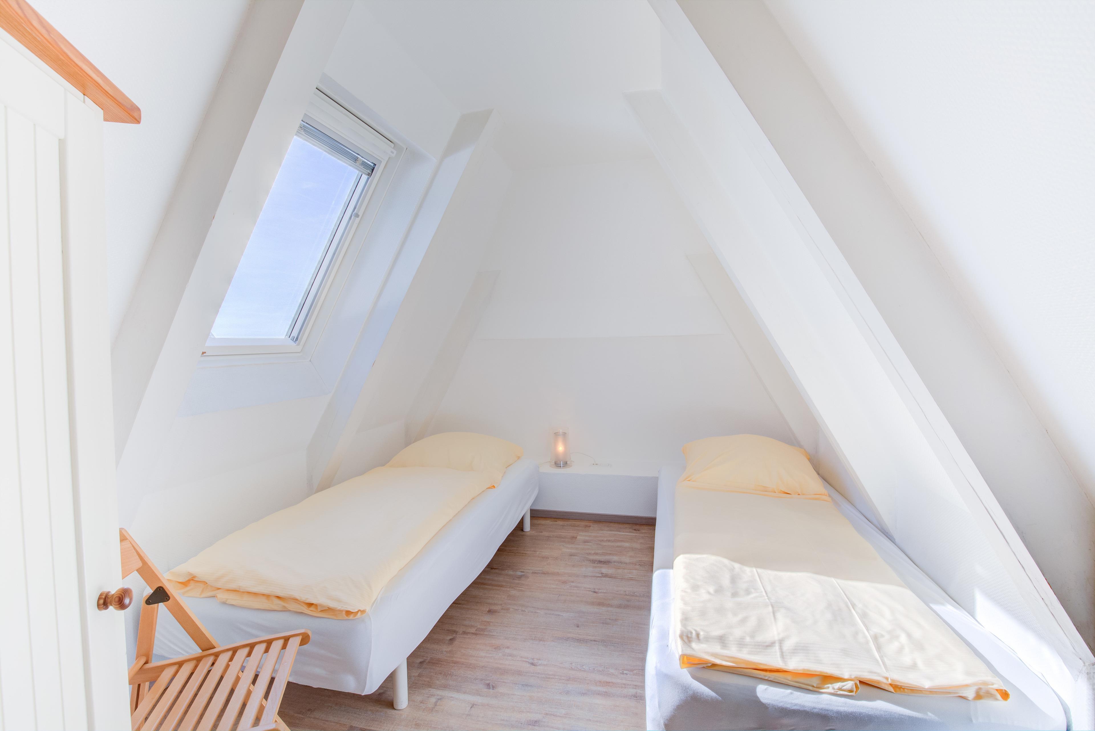 Unter Dachschrägen schlafen Sie entspannt in dem anderen Schlafzimmer mit Doppelbett und Fernseher. Für die Kleinen gibt es ein schönes Kinderzimmer mit zwei Einzelbetten. Zudem befindet sich auf dieser Ebene das zweite Duschbad.