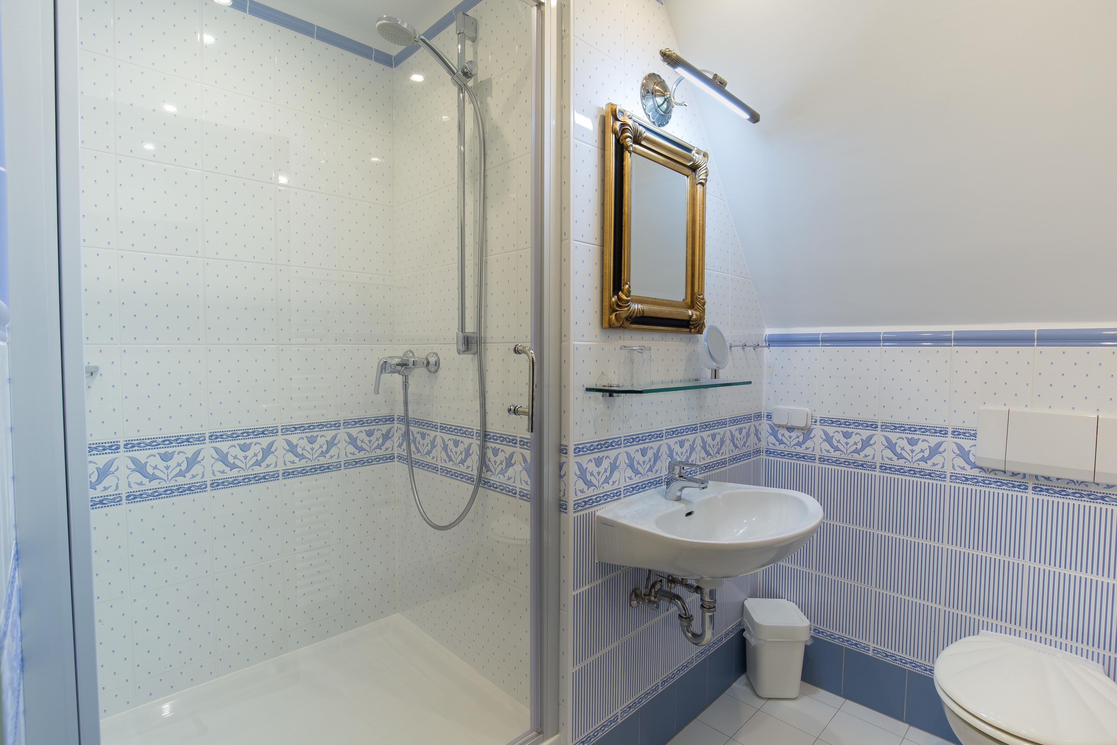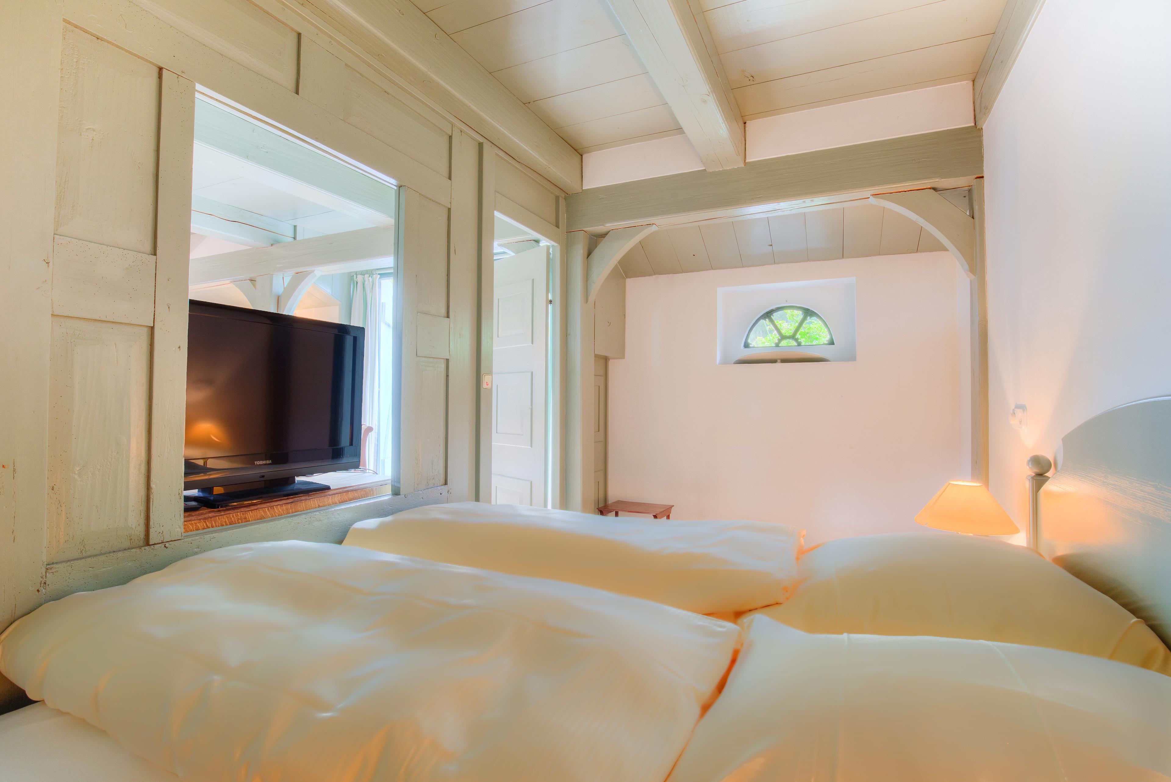 Etwas ganz Besonderes ist das nach friesischen Vorbildern gestaltete Schlafzimmer im Erdgeschoss, welches durch Schiebeelemente von dem Wohnzimmer getrennt ist und einen tollen Blick auf den abgeschiedenen Gartenbereich erlaubt. Weiterhin befindet sich ein schönes Duschbad mit Fenster im Erdgeschoss.
