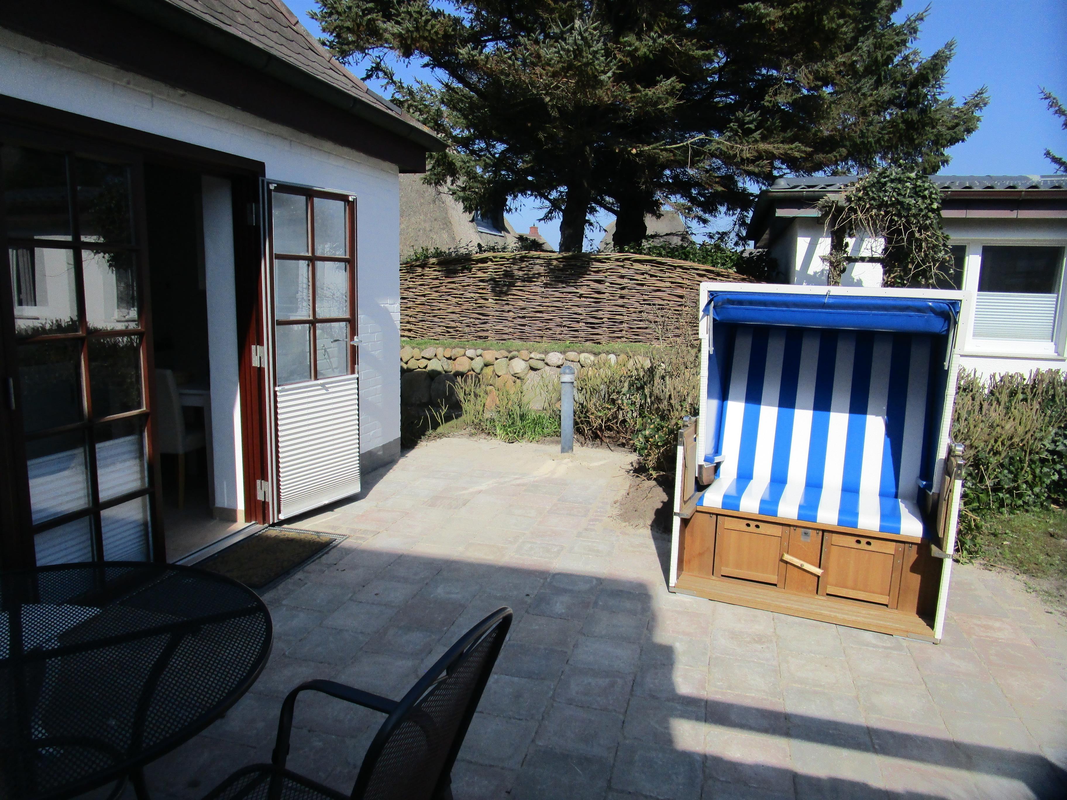 Die Wohnung hat einen eigenen Eingang . Zur eigenen Terrasse gehören Gartenmöbel und der Strandkorb.