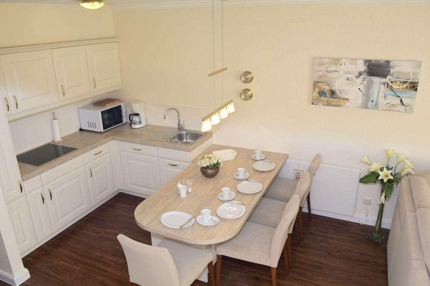 Koch-/Wohn-/Essbereich: Eine helle Landhausküche mit behaglichem Essbereich lädt Sie zum Verweilen ein. Der gemütliche Wohnbereich mit TV, führt Sie direkt auf den Süd-Balkon mit schönen Gartenmöbeln.