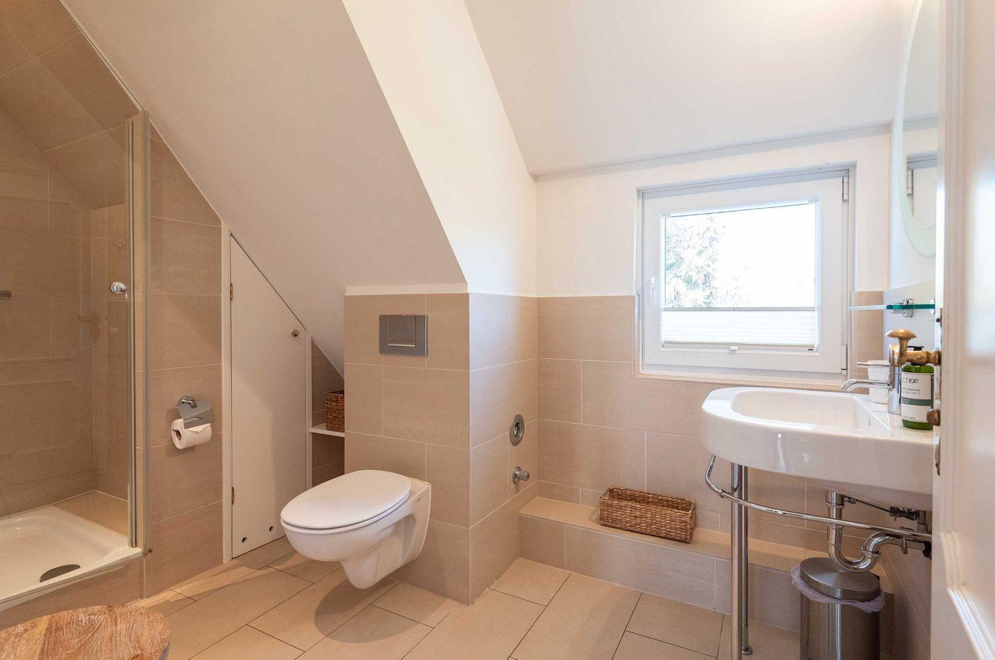 Badezimmer: Modernes Duschbad mit WC und Fenster.