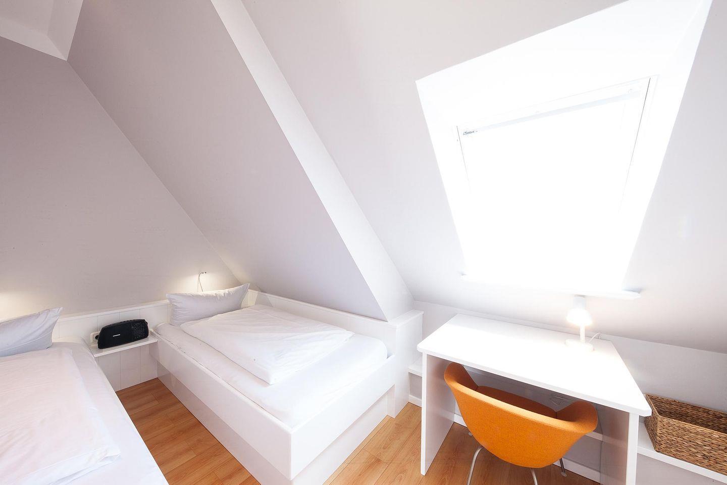 Schlafzimmer 2: Eingerichtet mit zwei maßgefertigten Einbau-Einzelbetten und kleinem Schreibtisch sowie einem Dachfenster.