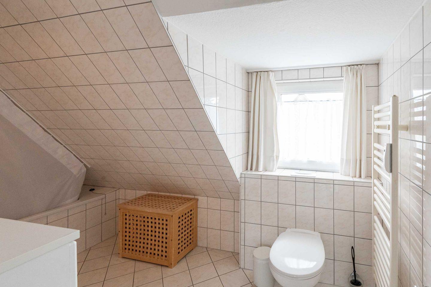 Badezimmer: Helles, modernes Vollbad mit WC und Fenster.