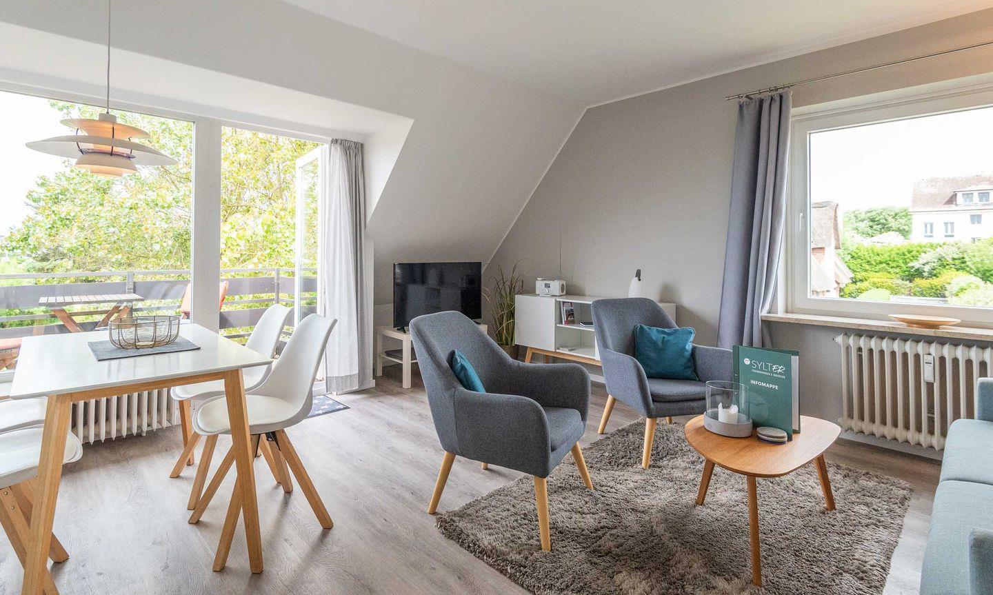 Wohnbereich: Großzügiger Wohnbereich mit modernen Polstermöbeln, TV und hochwertigem Esstisch. Das bequeme Schlafsofa bietet ggf. eine Schlafstätte für 2 Personen. Der schöne Balkon nach Westen lädt zum langen Verweilen ein.