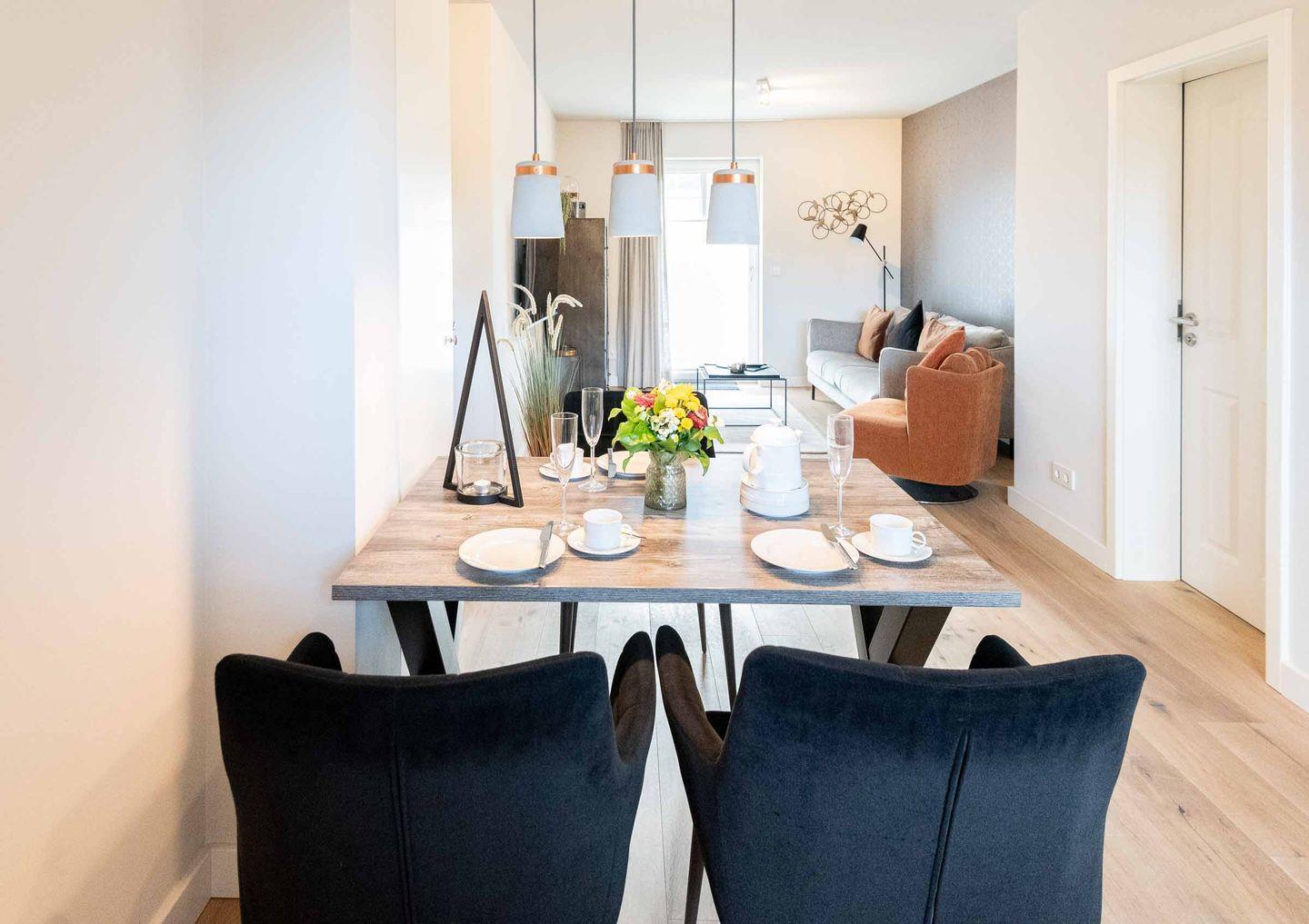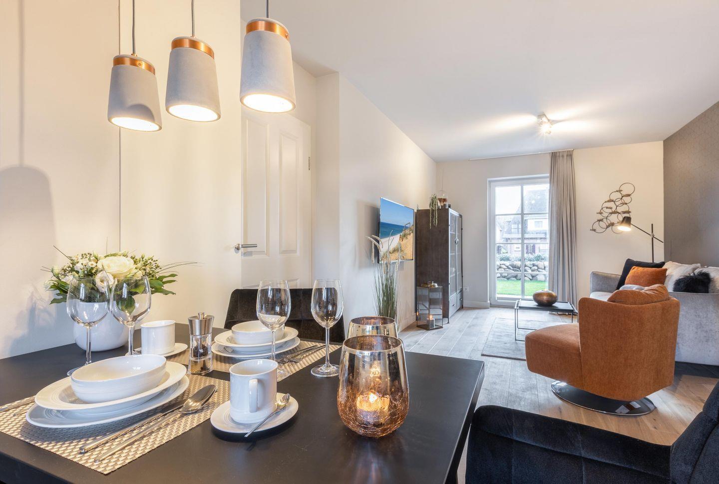 Koch-/Ess-/Wohnbereich: Neben einer kleinen Küchenzeile befindet sich der Esstisch für 4 Personen. Zudem vervollständigt eine komfortable Sofaecke inklusive TV den Wohnbereich. Die Wohnung ist in Richtung Süden ausgerichtet und daher sehr hell. Die großen Fenster und der Ausgang auf die eigene möblierte Terrasse laden zum Urlaub machen ein.