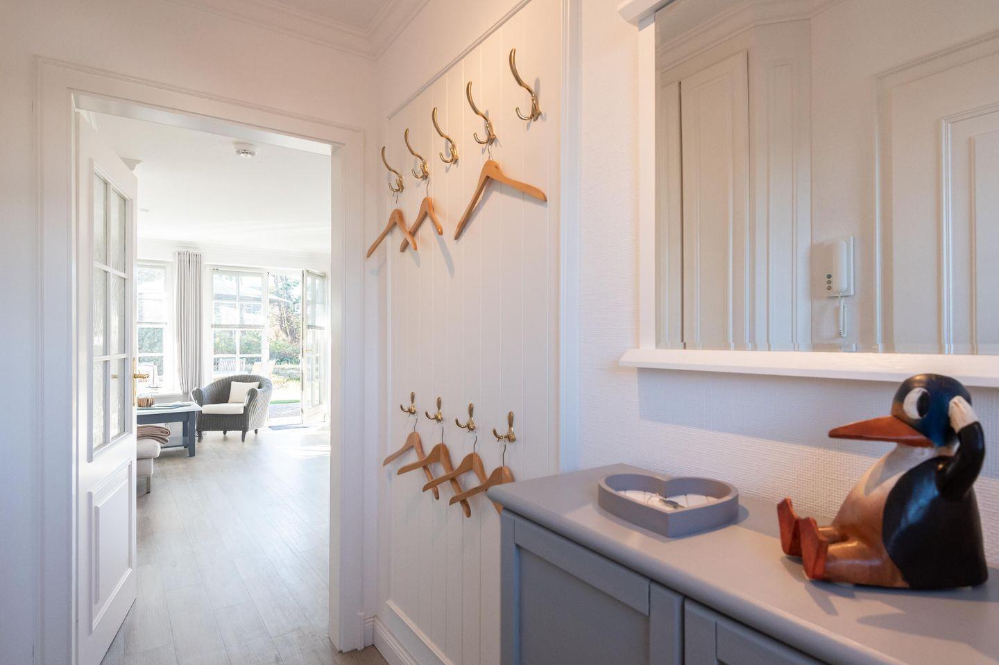 Im lichtdurchfluteten Erdgeschoss befindet sich ein kleiner Flur mit Garderobe und Schuhschrank und die gut ausgestattete Küche mit direktem Durchgang zum Wohn- und Essbereich: