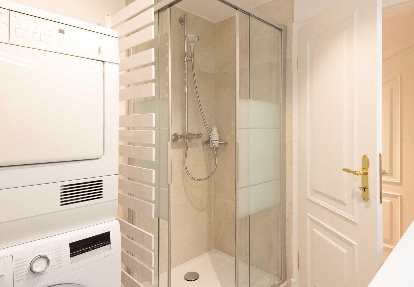 Badezimmer: Helles Bad mit Fußbodenheizung, bodentiefer Dusche, Handtuchtrockner, Waschmaschine, Trockner und Fenster.