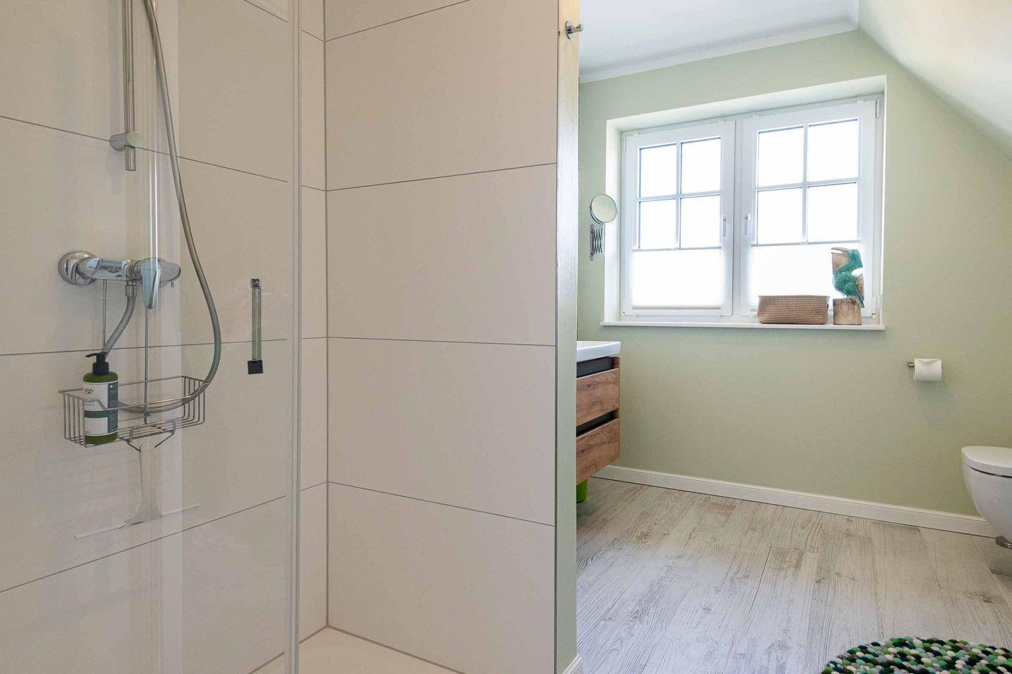 Badezimmer 2 & Sauna: Großzügiges maritimes Badezimmer mit bodengleicher Regendusche, Handtuchtrockner, Fenster und großer Sauna zur Eigennutzung.