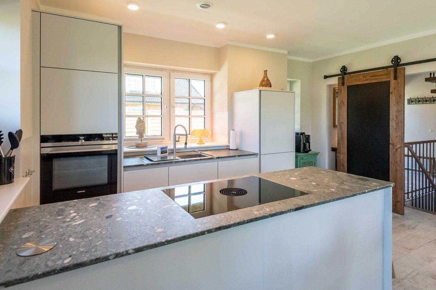 Die sehr wertig ausgestattete Küche mit BORA Herd, wunderschöner Granitarbeitsplatte und Kochfeldabzugssystem lässt für Hobby-Köche keine Wünsche offen. Ein heller und großzügiger Essbereich sowie eine gemütliche Sofaecke mit TV laden zum Verweilen ein. Von hier gelangen Sie in den neu angelegten Garten mit hochwertig möblierter Süd-Terrasse und Strandkorb.