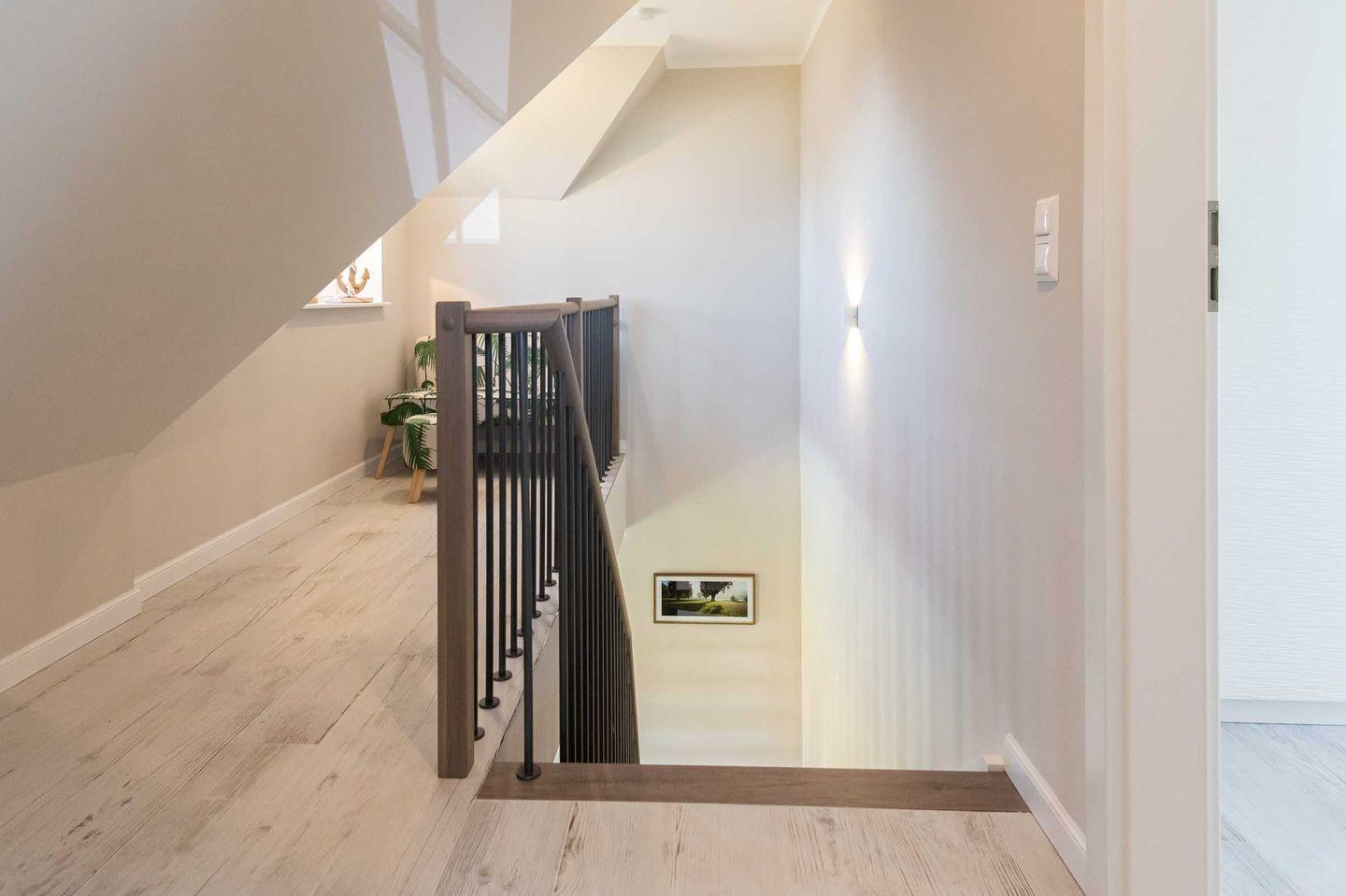 Über eine freitragende Treppe gelangen Sie in das exklusiv eingerichtete Obergeschoss: