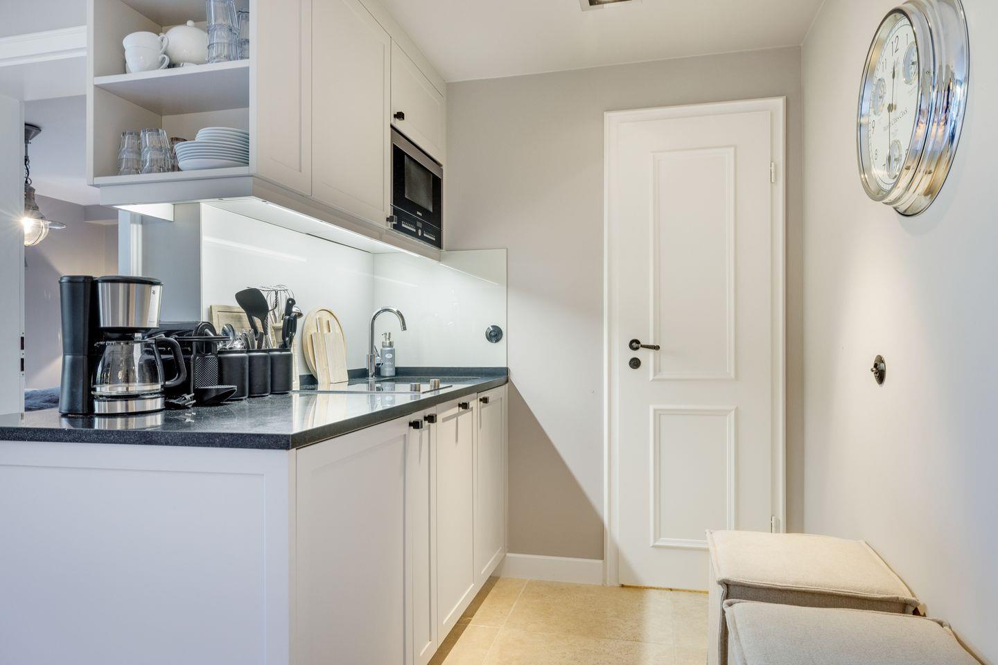 offene Wohnküche (GS, Mikrowelle) mit angrenzenden Essplatz mit liebevoll ausgewähltem Geschirr, Gläsern und Küchenutensilien