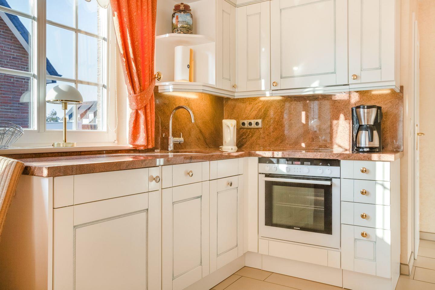 EG: Wohn-/Essbereich mit Flatscreen-TV, CD-Player, Radio und WLAN, integrierte Küche mit Backofen, Geschirrspülmaschine, Wasserkocher und Kaffeemaschine, kleines Gäste-WC, sonnige Süd-Terrasse mit Gartenmöbeln und Strandkorb (möbliert ca. von April-Oktober)