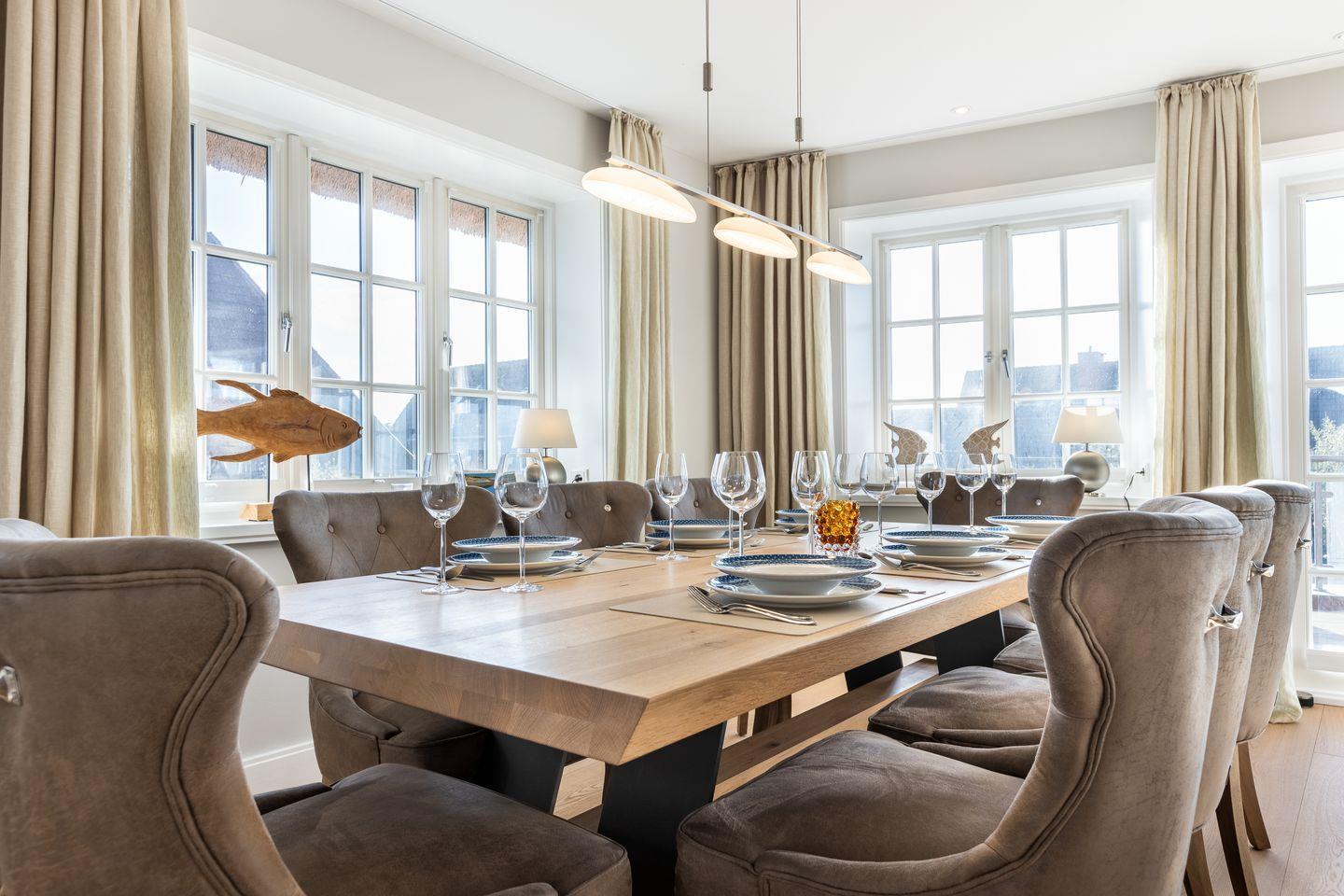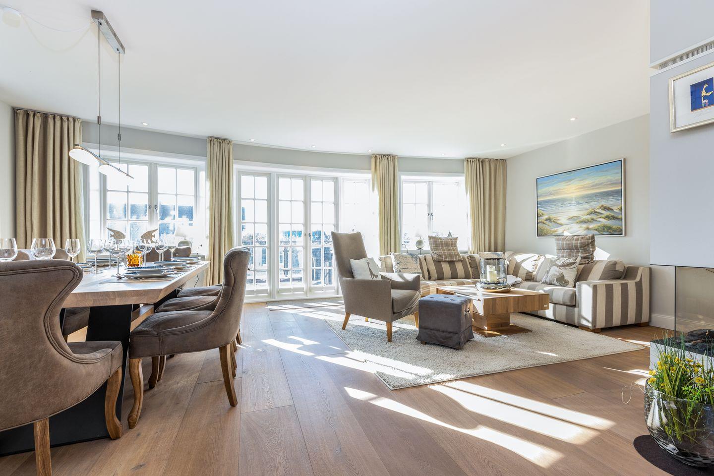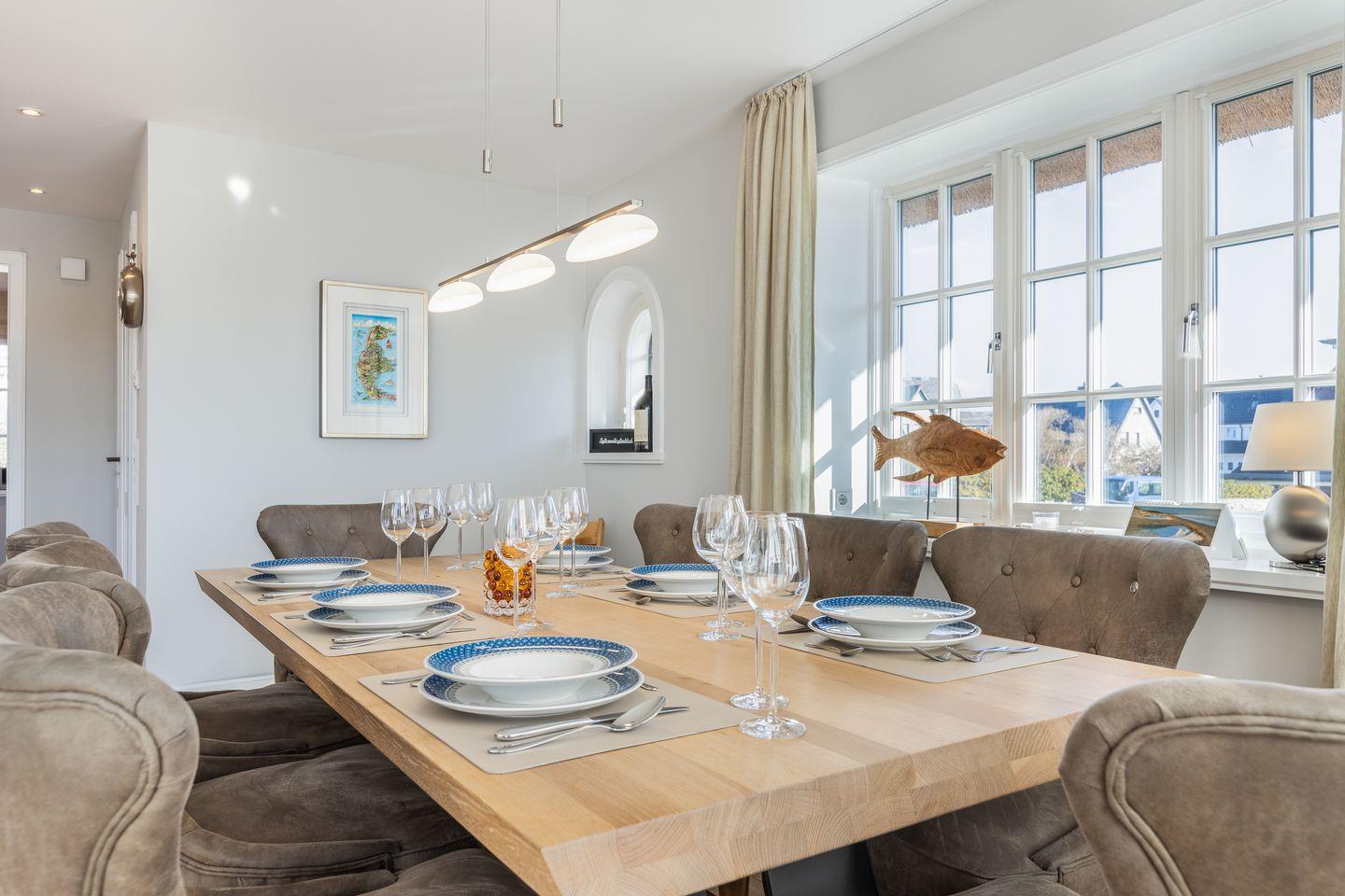 Das Erdgeschoss des Hauses empfängt Sie mit einem großen Wohn- und Essbereich. Genießen Sie die gemeinsamen Stunden mit der Familie vor dem Kamin oder kochen Sie sich Ihr Urlaubs-Dinner in der Top-ausgestatteten Küche. Durch Dekoration mit Strandflair und die perfekt abgestimmte Einrichtung des Hauses werden Sie hier gleich am ersten Tag Ihr Sylter Urlaubsgefühl spüren. Vom Wohnzimmer aus haben Sie Zugang auf die große Terrasse des Hauses mit Blick zu der beliebten Wenningstedter Promenade. Im Erdgeschoss finden Sie außerdem einen großzügigen Eingangsbereich mit viel Stauraum und ein Gäste-WC.