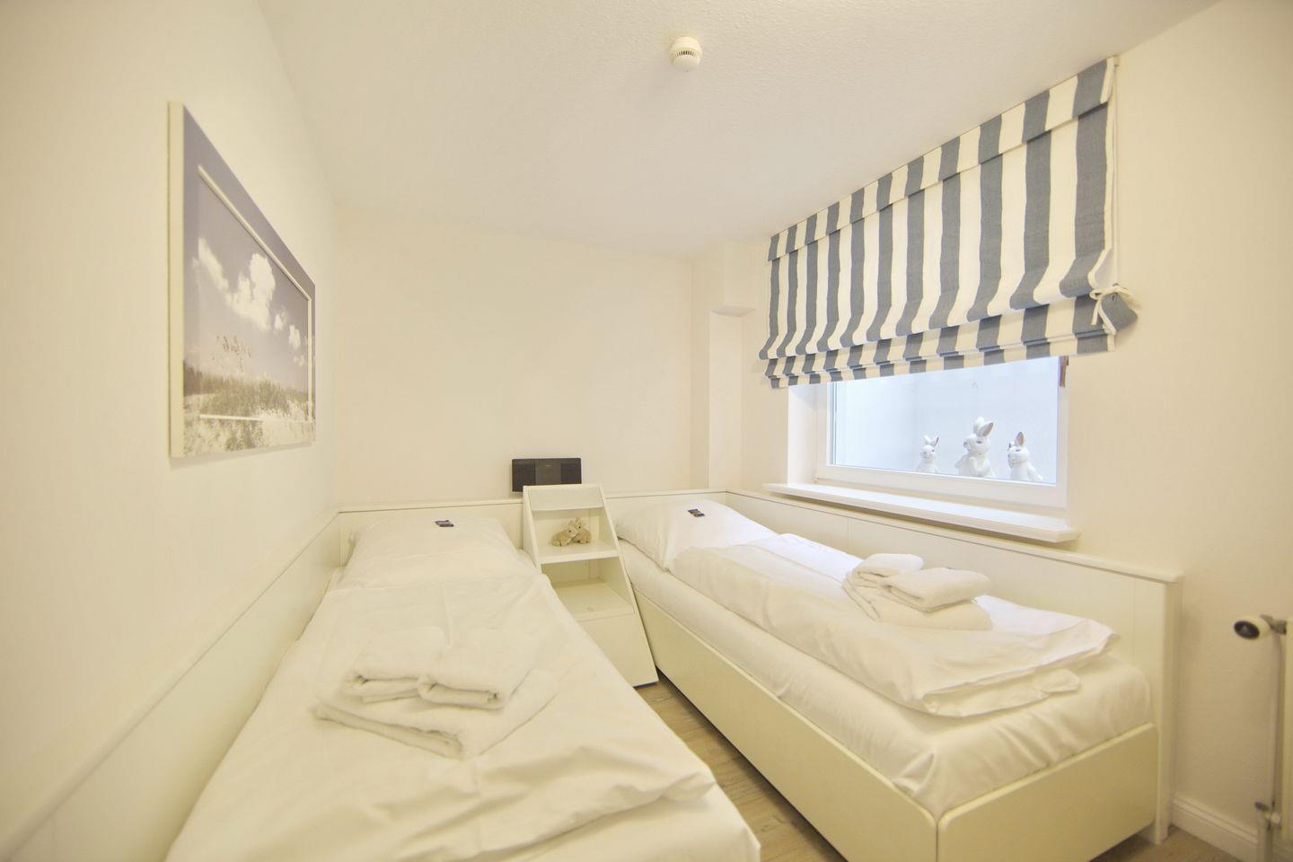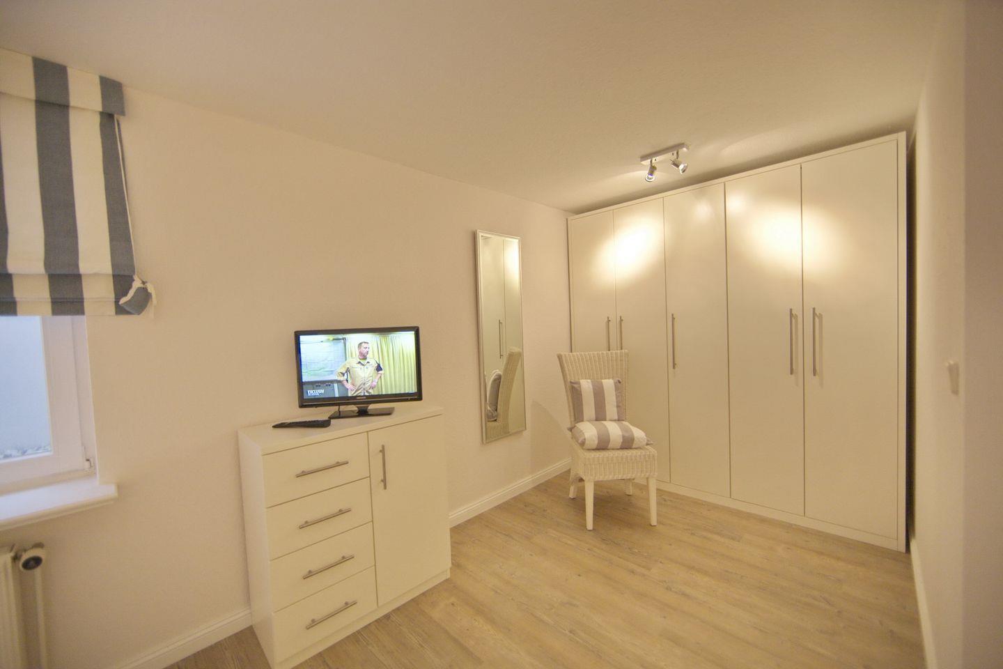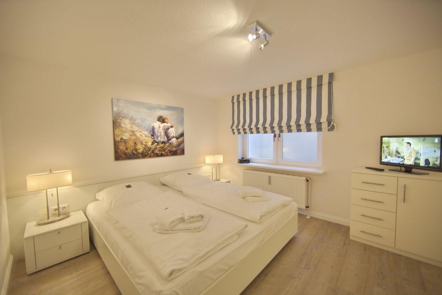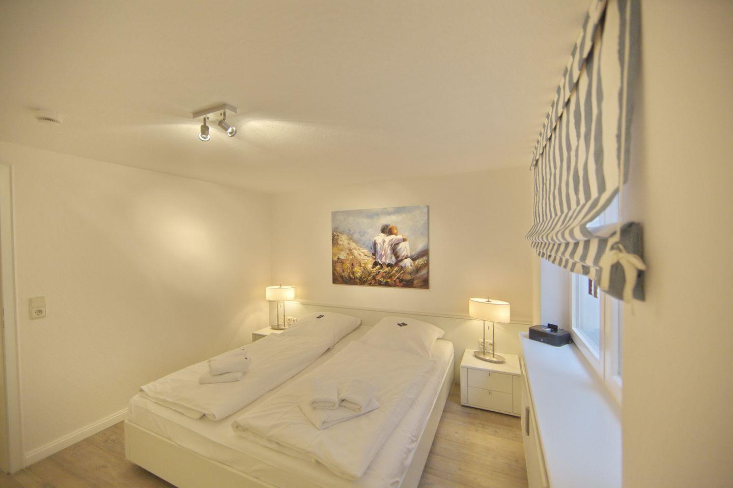 UG: 1 Raum mit Doppelbett (180x200cm) sowie 1 Raum mit 2 Betten (80x200cm). Dusche/WC. Sehr schöne Süd-Terrasse mit Strandkorb (ca. von April-Oktober).