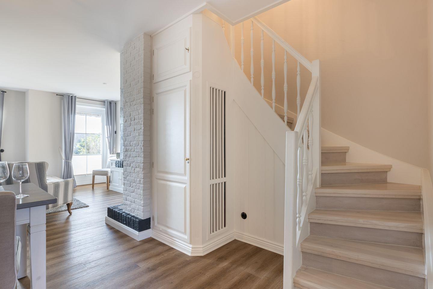Vom Wohnzimmer aus erreichen Sie eine kleine Südterrasse, die mit einem Strandkorb möbliert ist. Das Erdgeschoss der Wohnung verfügt außerdem über ein Gäste-WC. Über die Treppe erreichen Sie das Obergeschoss, in dem Sie ein großes Schlafzimmer mit Doppelbett, einen Schlafraum mit einem Einzelbett und ein Badezimmer mit Dusche und WC. Im Dachgeschoss befindet sich das dritte Schlafzimmer, das über zwei Einzelbetten verfügt.