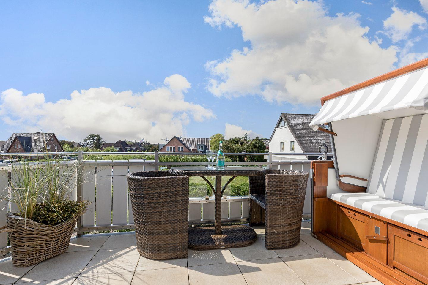 Obergeschoss: geschmackvoll und farblich gekonnt aufeinander abgestimmte Möblierungen, Farben und Stoffe. Kabel-TV, Hifi-Anlage. Luxuriöse integrierte Küche mit Geschirrspüler und einem Mikrowellen-Backofen-Kombigerät. 1 Schlafraum mit 2 getrennten Betten (90x200cm) und sehr schönen Einbauten. Wohlfühl-Bad mit Dusche und WC. Sonniger West-Balkon mit Teak-Gartenmöbeln und eigenem Strandkorb.