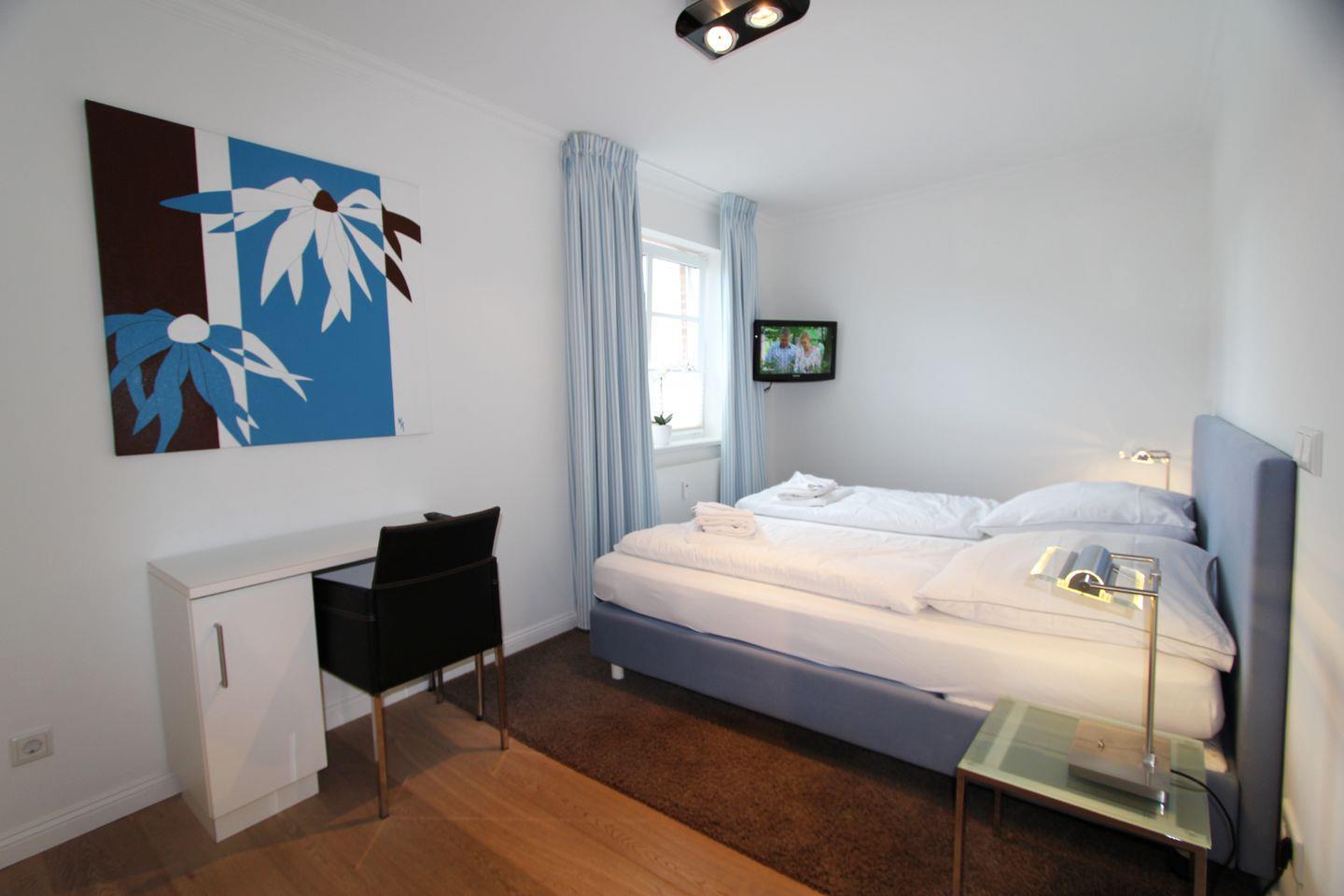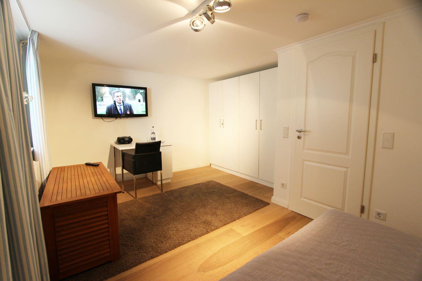 Das Hausteil verfügt über drei separate Schlafräume. Im Erdgeschoss befindet sich ein Doppelschlafzimmer mit Boxspringbett (durchgehende Matratze). Zwei weitere Doppelschlafräume mit Boxspringbetten (180 cm und 160 cm) befinden sich im Untergeschoss. Alle Schlafzimmer verfügen über ein TV-Gerät.