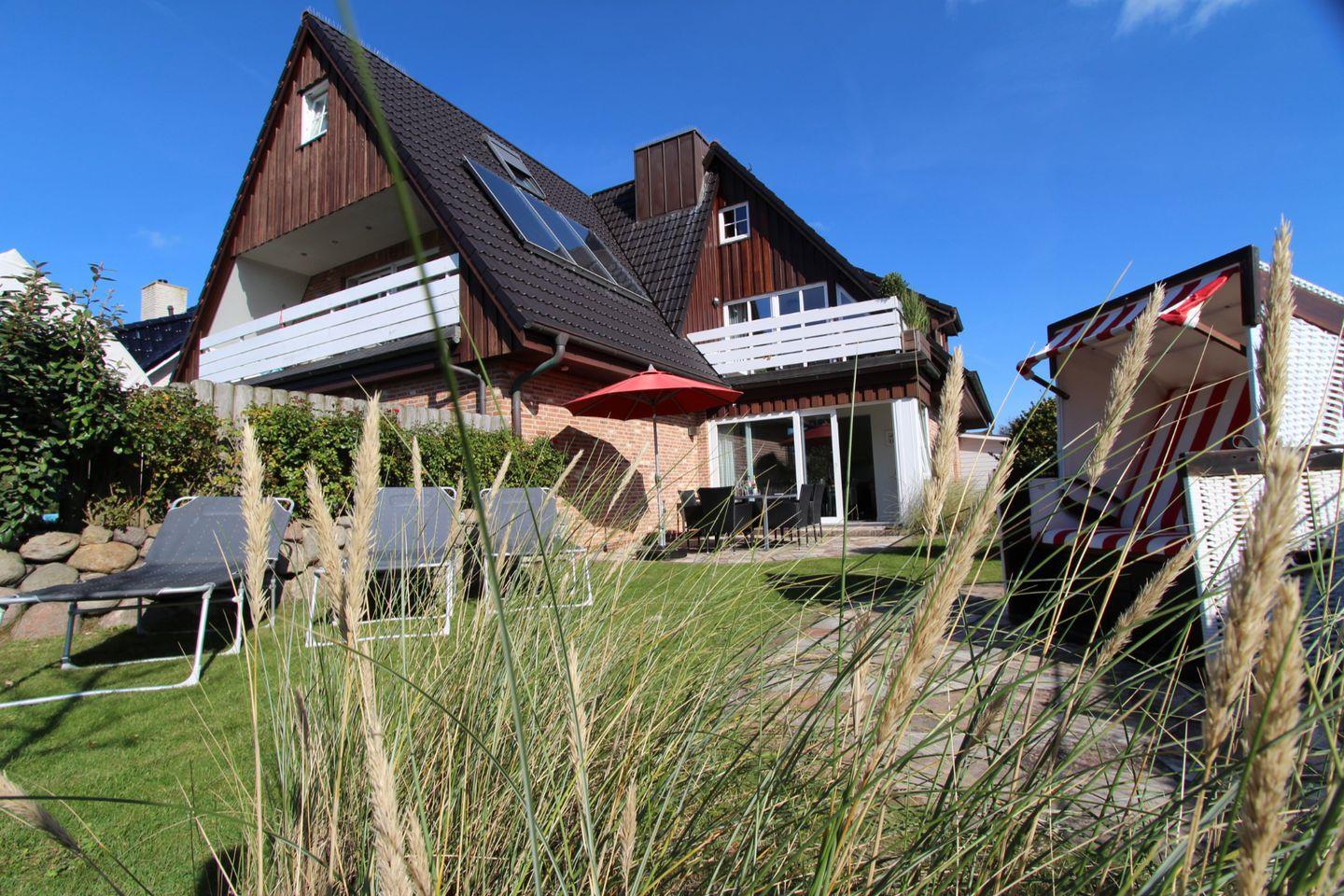 Diese großzügige Ferienwohnung auf zwei Etagen mit 112 qm Fläche bietet Ihnen und Ihrer Familie das perfekte Domizil für unvergessliche Ferientage. Die ruhige Lage im Süder Wung in Wenningstedt verspricht erholsame Stunden im großen Garten mit Sonnenliegen und Strandkorb (April - Oktober). Einkaufsmöglichkeiten, Restaurants, Fahrradverleih und vieles mehr erreichen Sie bequem in wenigen Minuten. Ein Hund (bis Kniehöhe) darf auf Anfrage mitgebracht werden!
