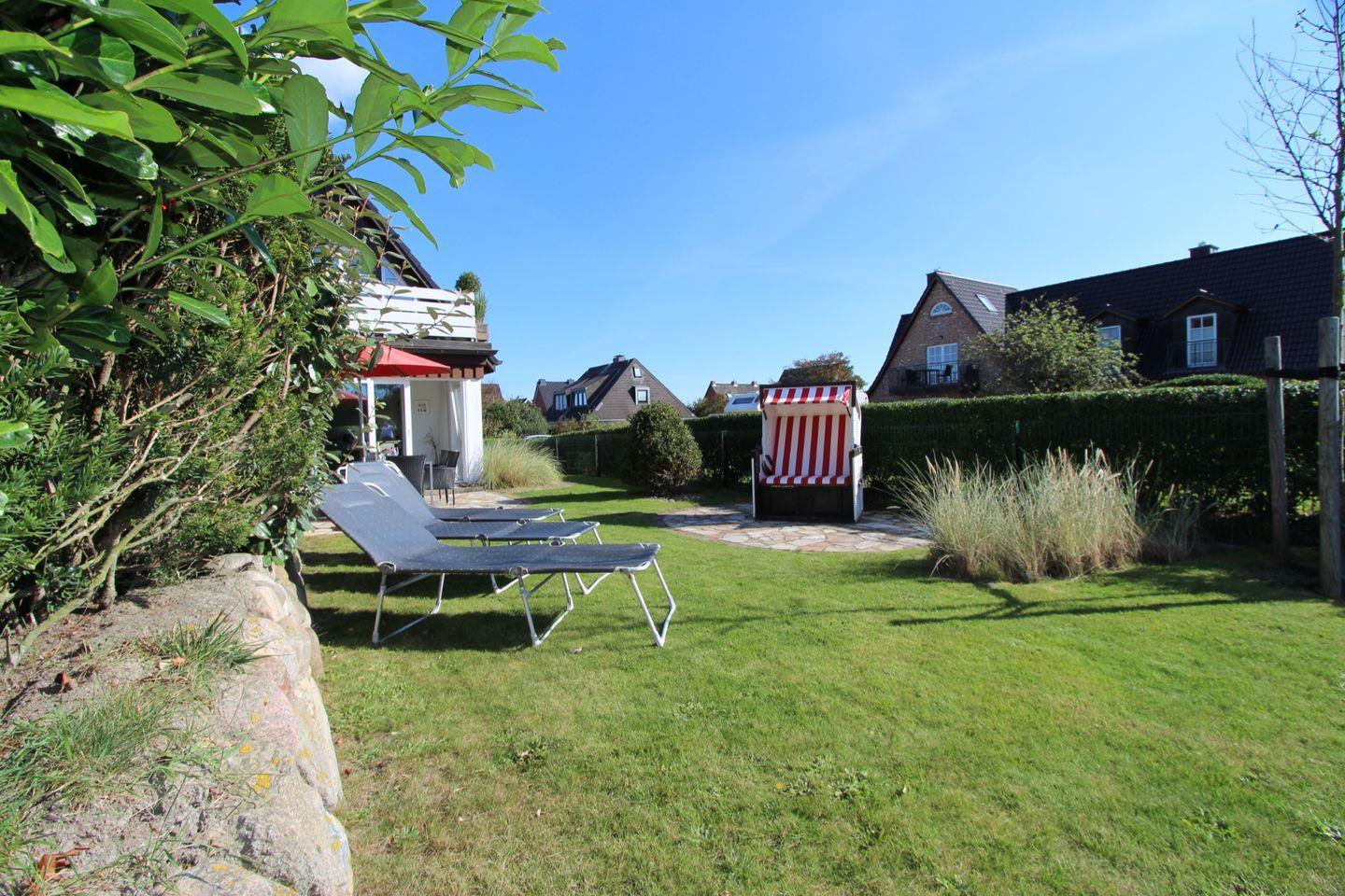 Vom Wohnbereich aus geht es in den Garten auf die Sonnenterrasse mit komfortablen Gartenmöbeln. Der Strandkorb lädt im schön angelegten Garten mit Süd-Lage zum Verweilen ein.
