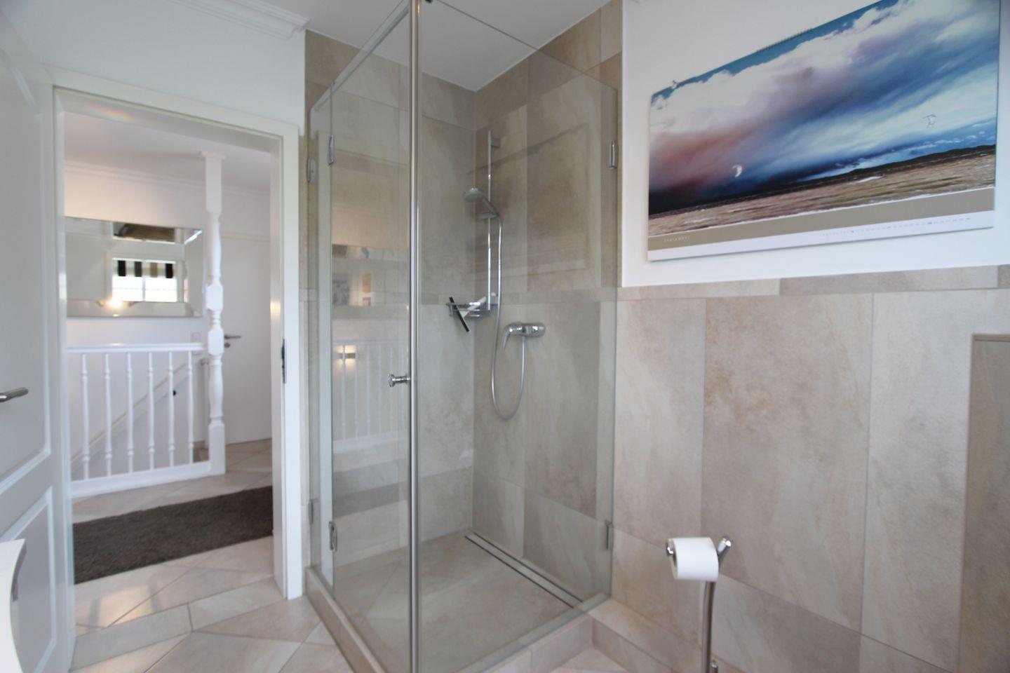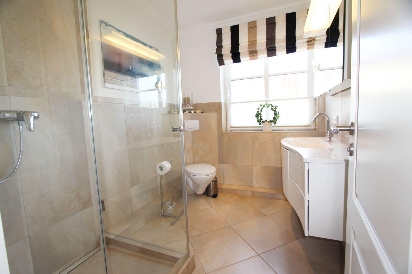 In der Wohnung befinden sich im Erdgeschoss und Untergeschoss jeweils ein Duschbad mit WC. Waschmaschine und Trockner stehen im Nebenraum im Keller für Sie bereit.