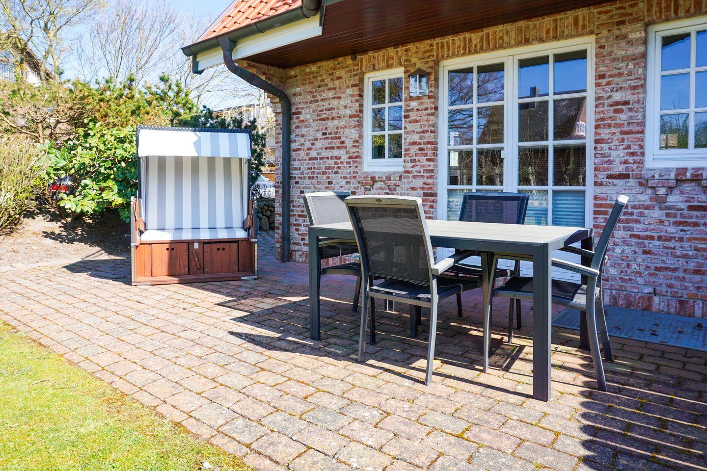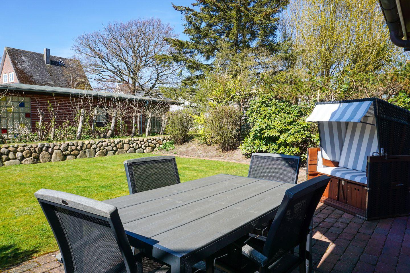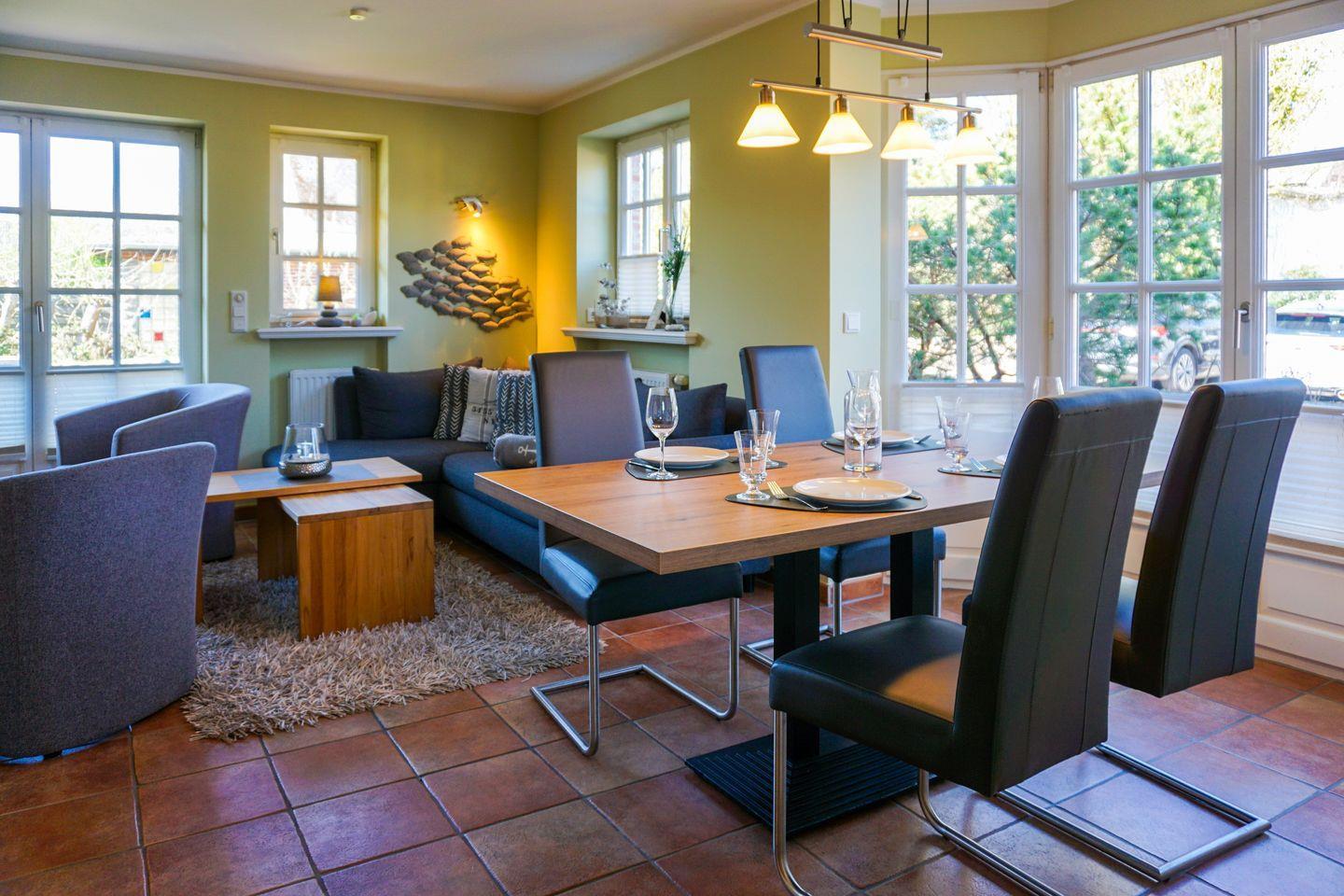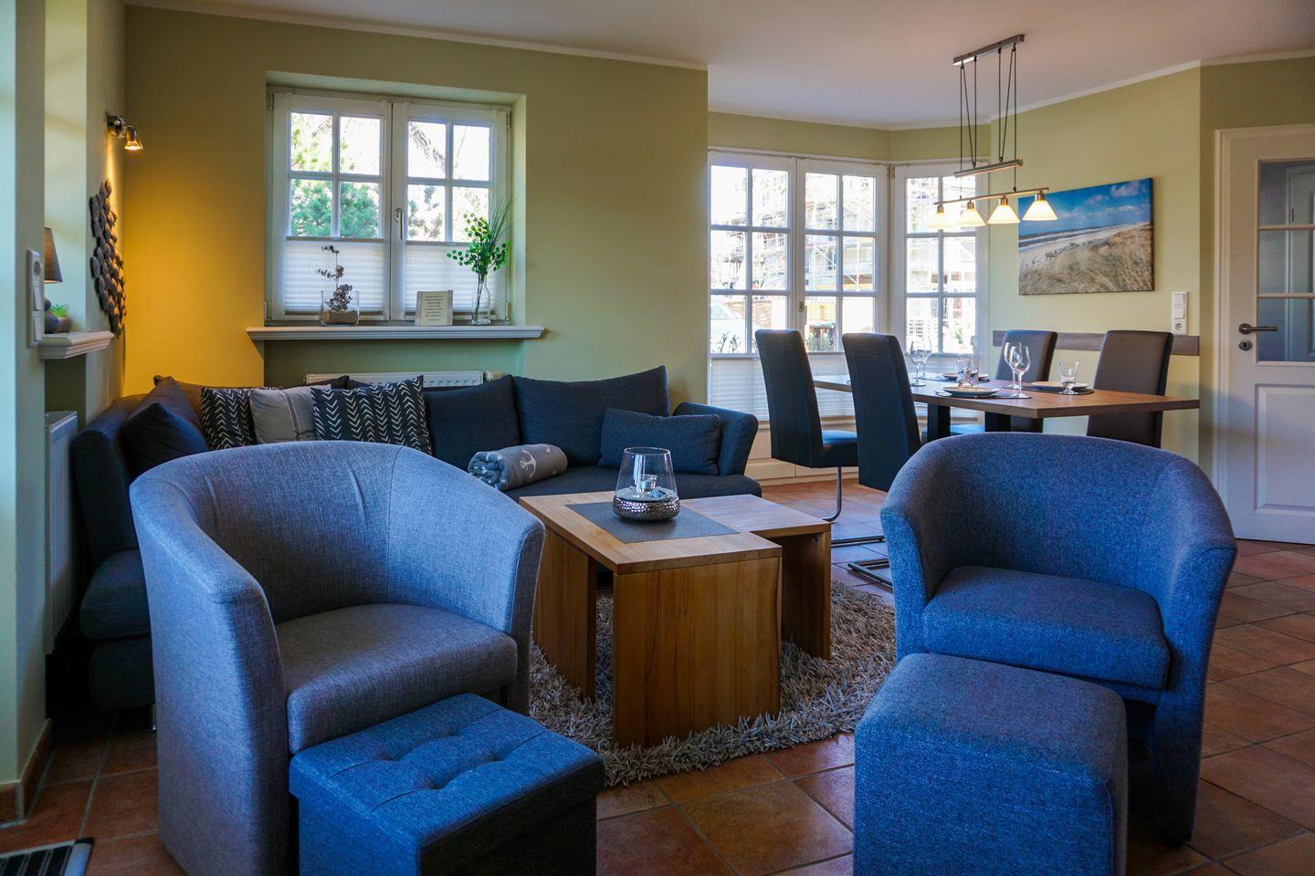 Erdgeschoss: Sehr großzügiger Wohnraum, der durch seine Helligkeit und liebevolle Möblierung besticht. Ein Kaminofen zaubert nicht nur zur kälteren Jahreszeit kuschelige Stunden und Behaglichkeit. Schöne Sitzecke mit L-Lounge Sofa im Erker. 46'' Samsung 3D-SMART TV mit 3D Brillen, eine Bose Soundtouch Musikanlage, sowie eine Bose Soundbar. Integrierte Küche mit Ceranherd, Backofen, Geschirrspüler, Mikrowelle und Nespressomaschine mit Milchaufschäumer. Design-Gäste-WC. Schöne West-Terrasse mit Gartenmöbeln und Strandkorb (ca. von April - Oktober). Geschützter Parkplatz.