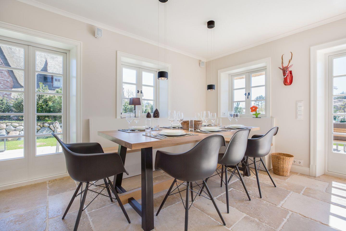 In ruhiger Lage Wenningstedts gelegenes Luxushausteil unter Reet. Ca. 126 qm Nutzfläche empfangen bis zu 6 Gäste im Erd-, Unter- sowie Obergeschoss.