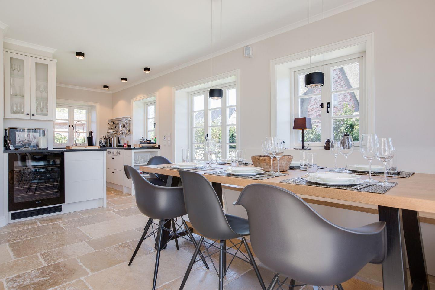 Kuschelige Abende in Ihrem stylishem Wohnbereich werden durch einen Gaskamin gekrönt, den Sie individuell über eine Fernbedienung steuern können, ultra bequem und genial einfach. An Ihrer großen Esstafel genießen Sie schöne Stunden, während Sie auf ein XXL Kunstwerk einer namhaften deutschen Künstlerin schauen. High-End Technik versteht sich im Hüs Kjerte eben so, wie fantastische Marken-Boxspringbetten made in Germany.