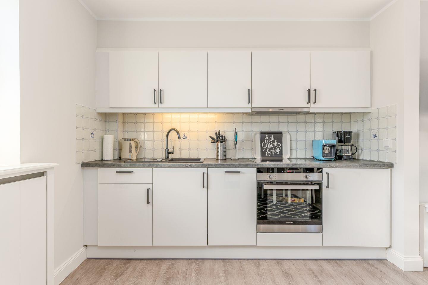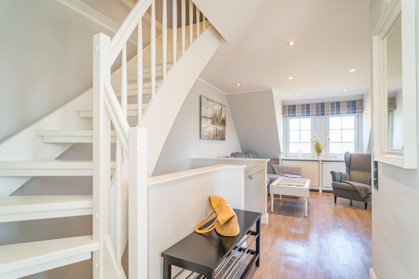 Die gekreideten Töne der Eichendielen ziehen sich durch alle Räumen und sorgen so für eine warme Atmosphäre. Helle Holzarbeiten und stilsichere Farbgestaltung verschaffen dabei eine behagliche Gemütlichkeit, die den nordischen Charakter dieses Appartements im Sylter Strandhaus Look prägt.
