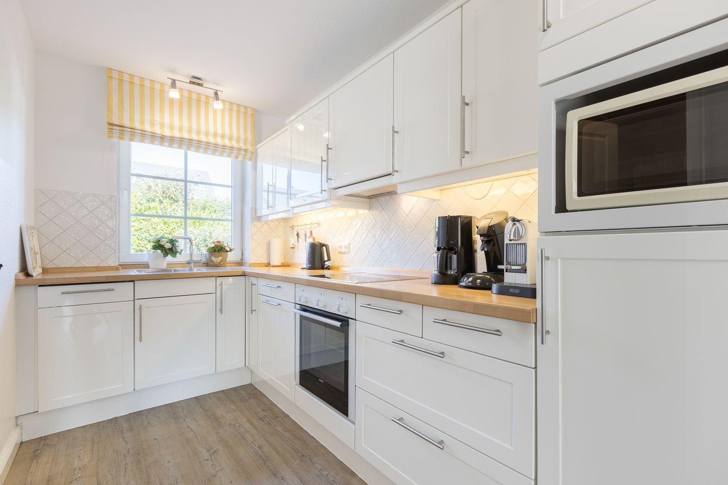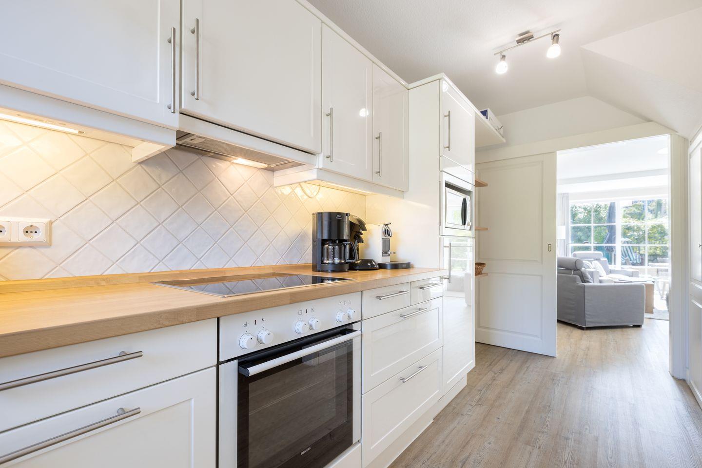 Küche mit Backofen, Mikrowelle, Geschirrspüler, Kühl/Gefrierkombi, Espresso- und Senseo-Kaffeemaschine, Heisluftfritteuse.