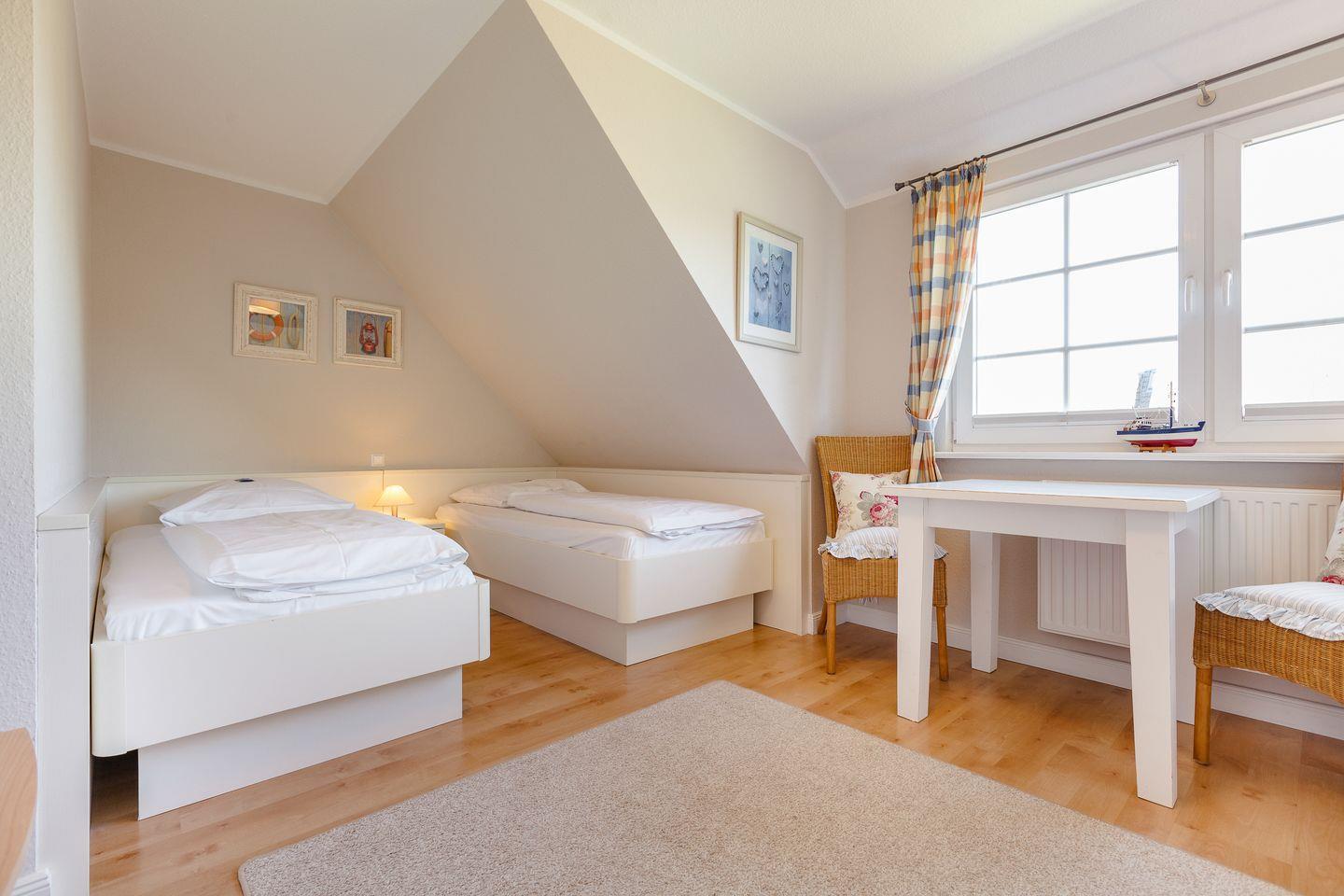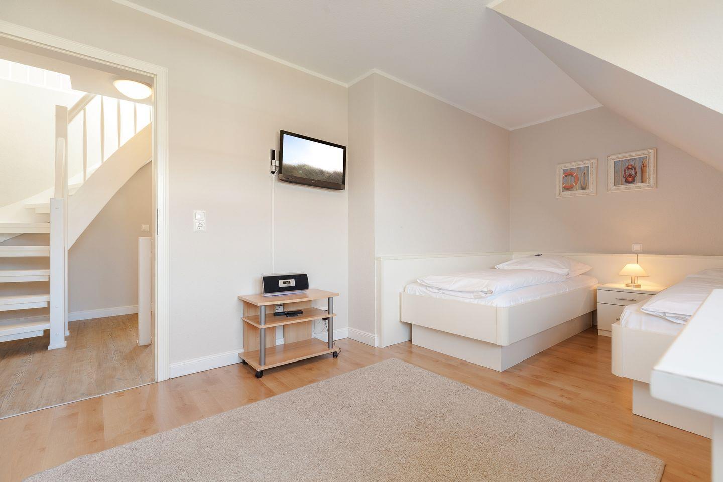 Dachgeschoss: Raum mit 2 getrennten Betten (je 90x180), TV, extra Galerie, ferner separater Raum mit Waschmaschine und Trockner.