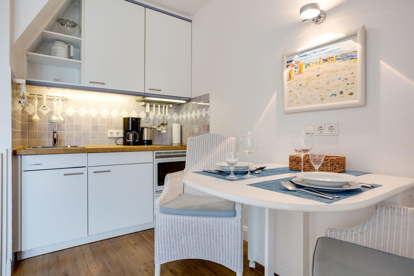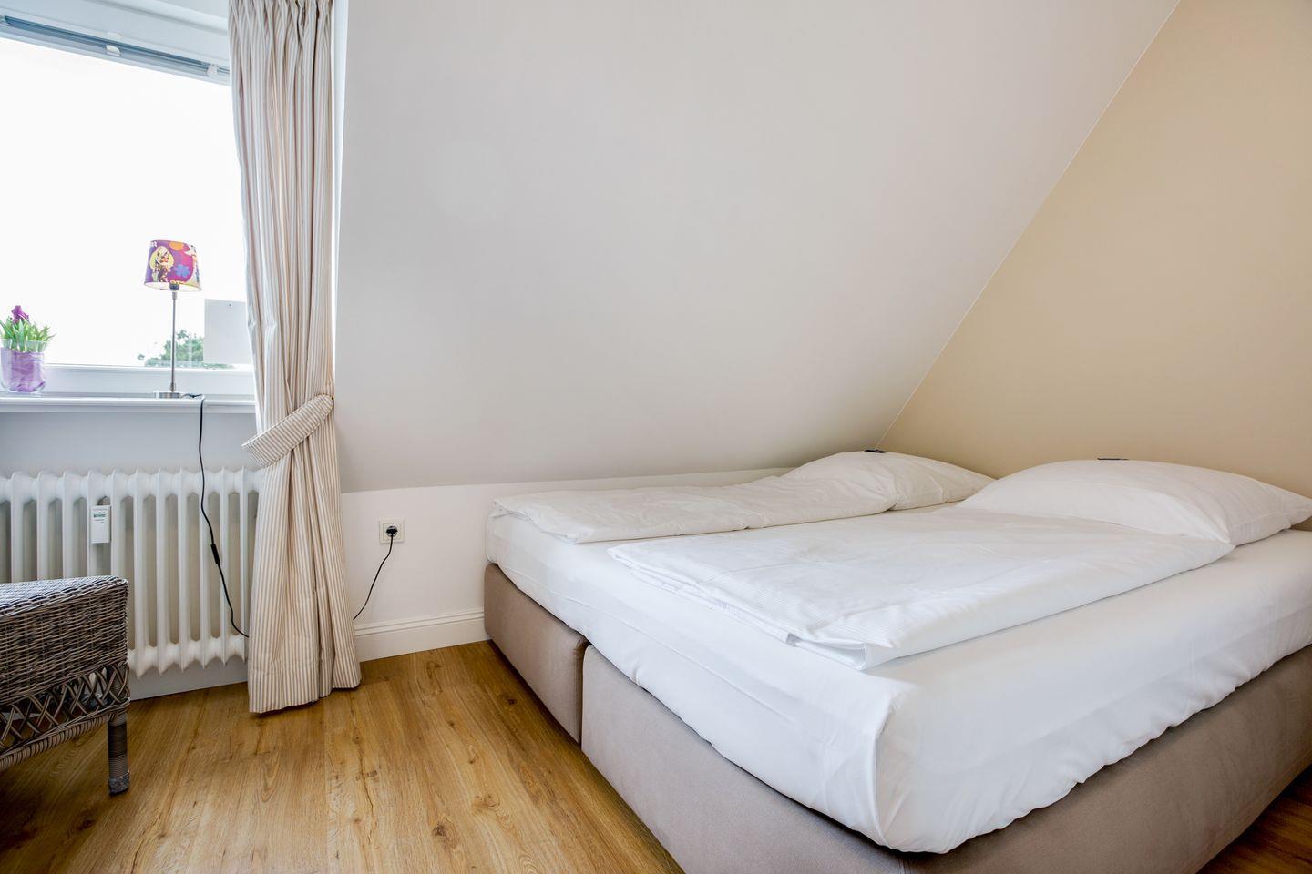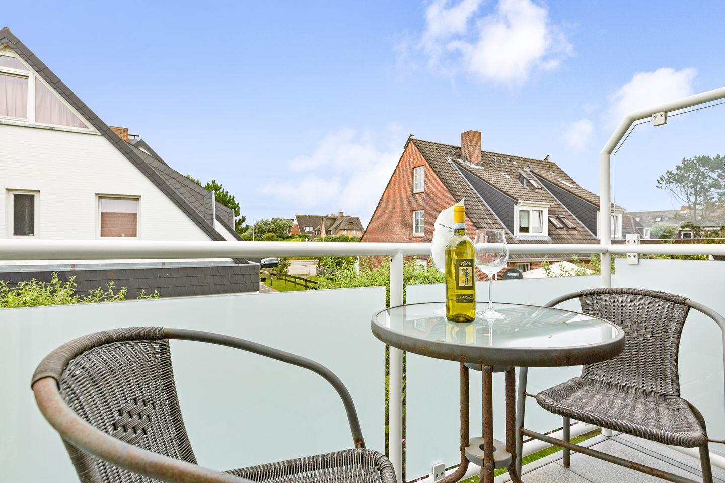 Den Sylter Sonnenschein genießen Sie am besten auf Ihrem kleinen Balkon mit Gartenmöbeln (ca. April-Oktober). Freuen dürfen Sie sich ebenfalls auf Ihr schönes Wohlfühlbad mit großer Dusche. Der Schlafraum im Obergeschoss erwartet Sie mit einem Doppelbett (140x190 cm) und viel Schrankplatz.