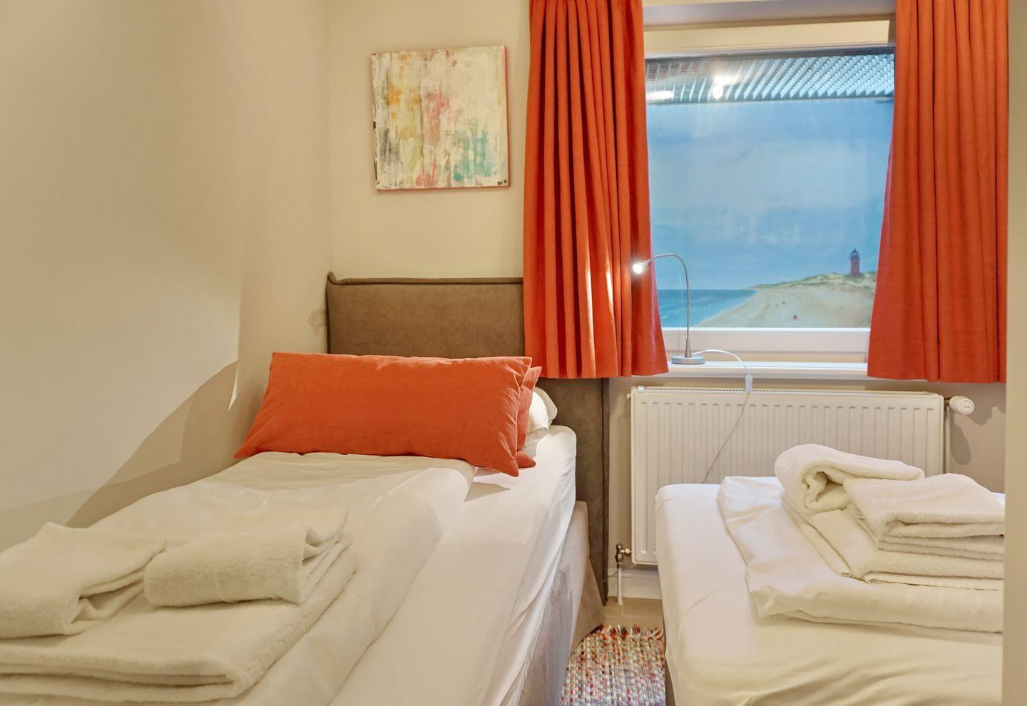 UG: 1 Raum mit Doppelbett (180x200cm) sowie 1 kleiner Schlafraum mit getrennten Betten (90x200cm). Dusche/WC. Sauna mit Dusche/WC. Waschmaschine und Trockner. Sehr attraktive und großzügige Süd-Terrasse mit Strandkorb (ca. von April–Oktober) und Gartenmöbeln. Parkplatz.